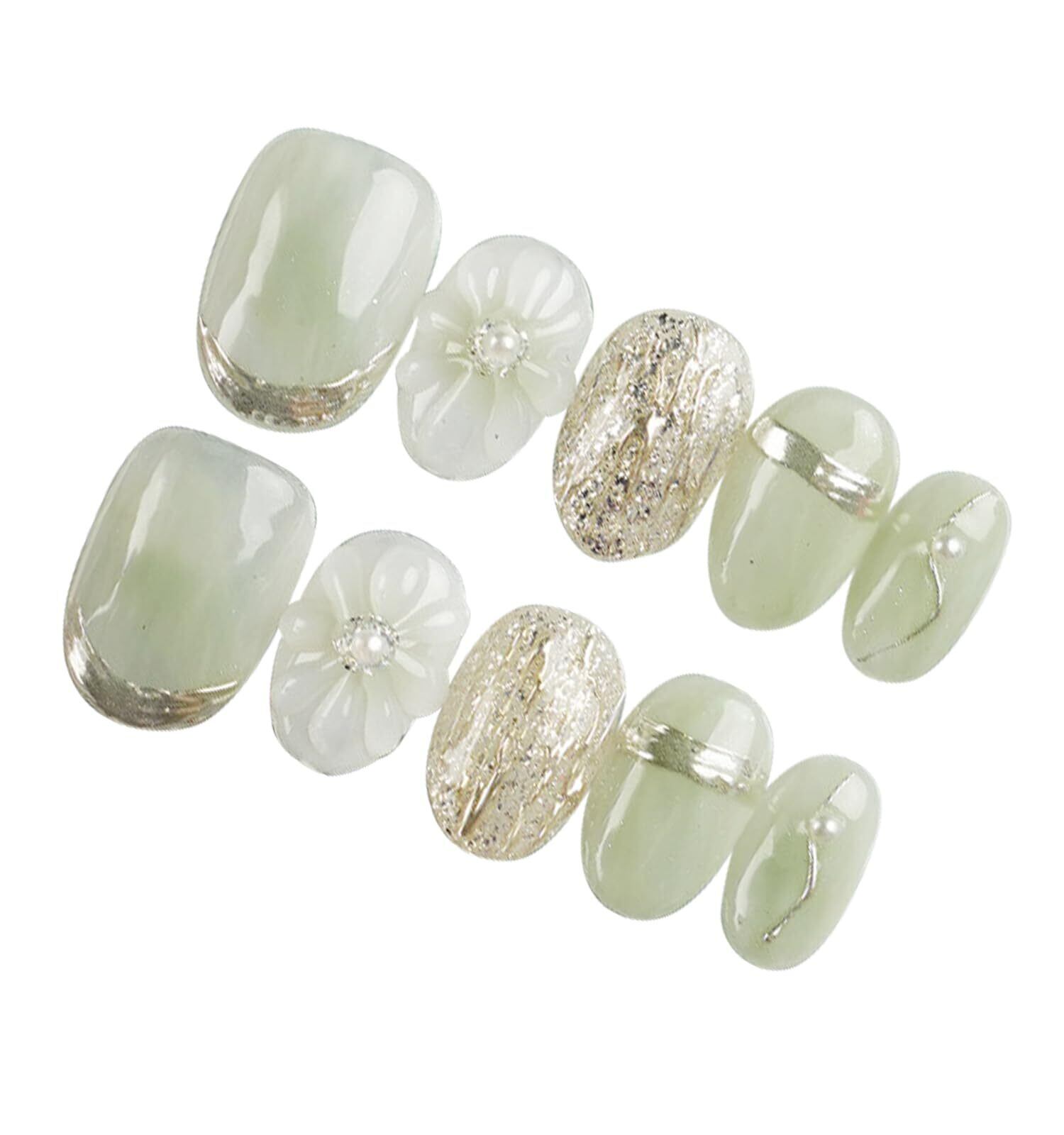 [Herbeluemily] ネイルチップ ショート 手作り 付け爪 3D 収納ケース 10枚入 フラワー マーメイド フラワーグリーン(オーバル) L HM-0098-R18-OVGR-L