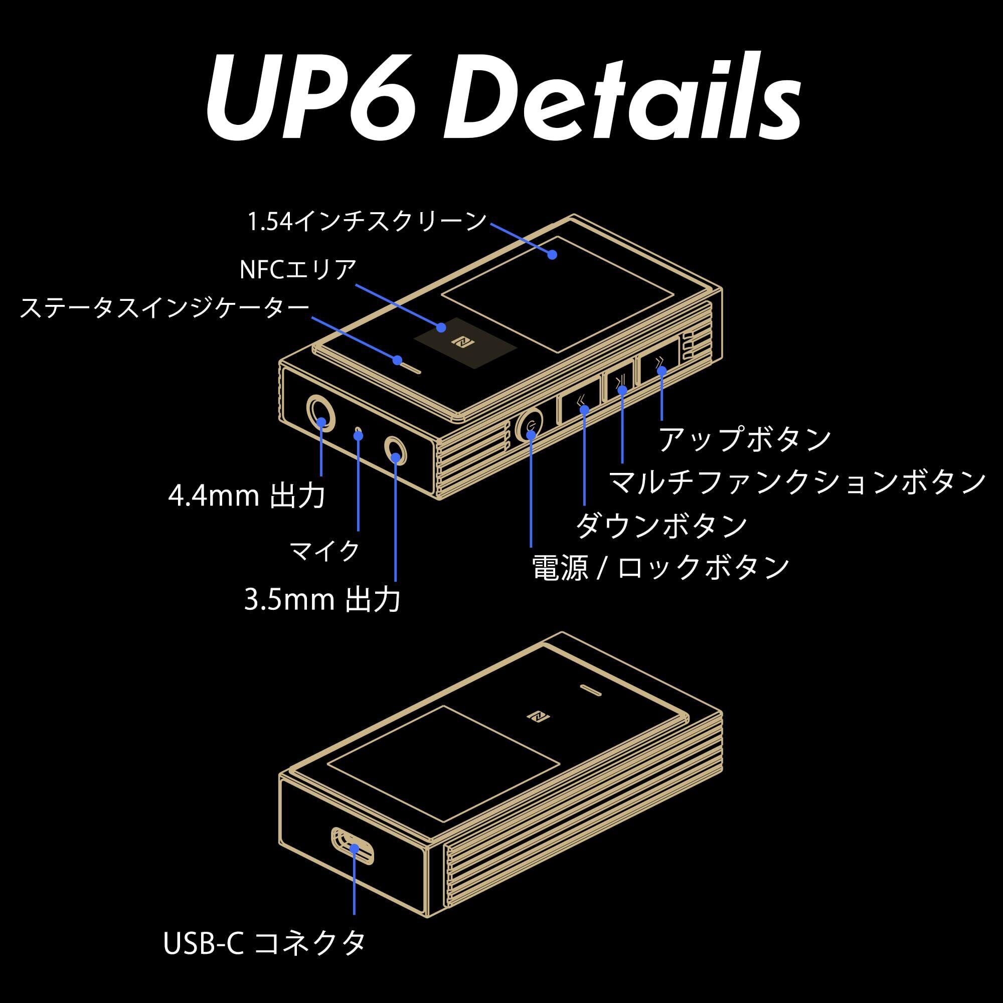 SHANLING UP6 マルチファンクションBluetoothレシーバー 高性能×高音質、次世代Bluetoothレシーバー&USB-DAC SHANLING UP6は、デュアルDAC構成・高出力アンプ・幅広いBluetoothコーデック対応を備えた多機能なポータブルDAC/AMPです。スマートフォン、タブレット、PC、ゲーム機に接続することで、いつでもどこでも高音質なリスニング体験を提供します。 デュアルES9069Q DACチップとSGMICRO製アンプを組み合わせ、最大626mWの出力と低歪・高ダイナミックレンジを実現。さらにXMOS XU316 USBチップと2基の水晶発振器を採用することで、PCM 768kHz/32bitおよびDSD512まで対応。USB-DACとしても極めて高性能です。