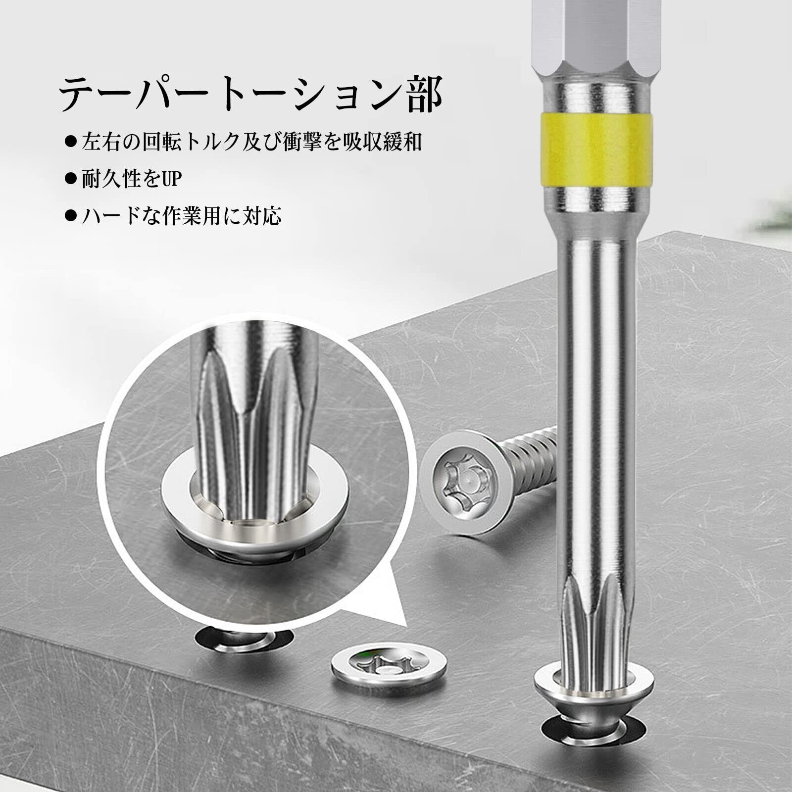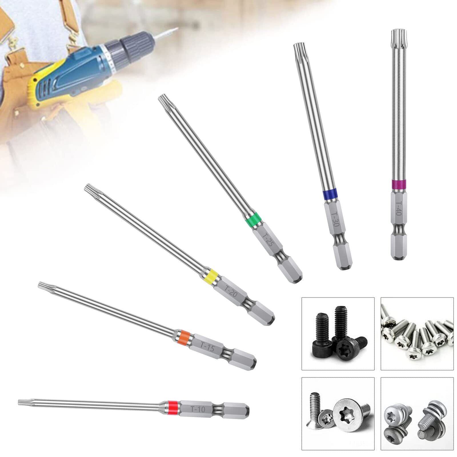 【商品仕様】サイズ:T10、T15、T20、T25、T30、T40(各サイズ1本ずつ)。セット内容:6本組。シャンク径:6.35mm。素材:クロムバナジウム鋼。硬度:HCR60±。