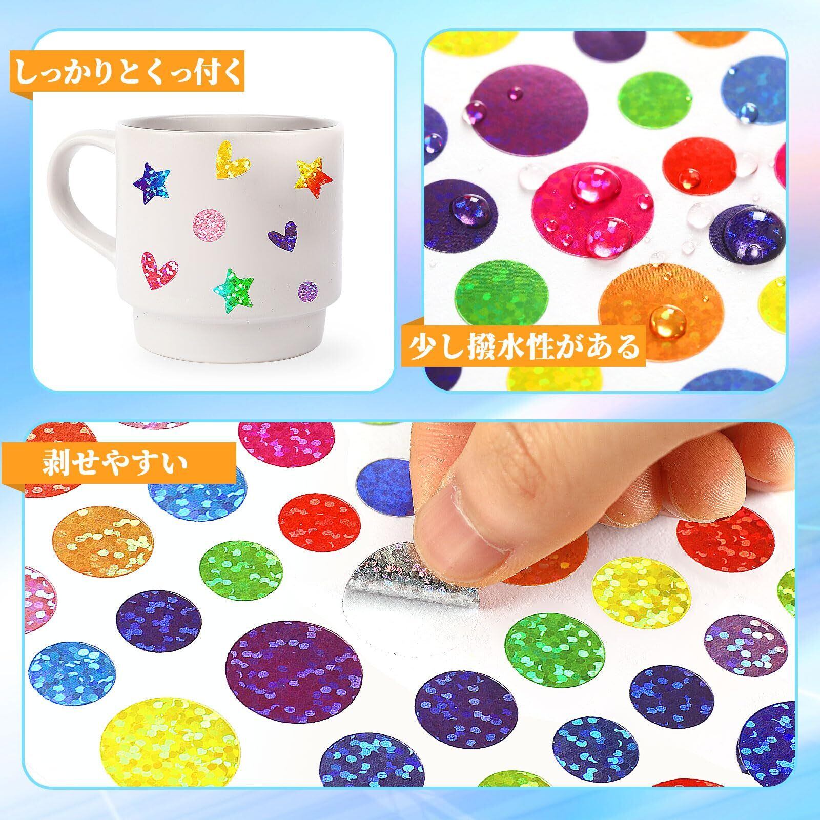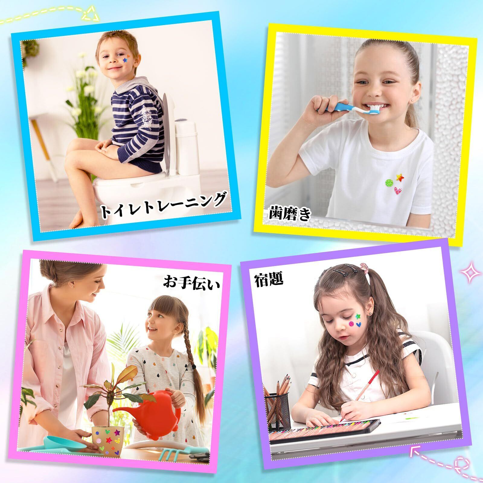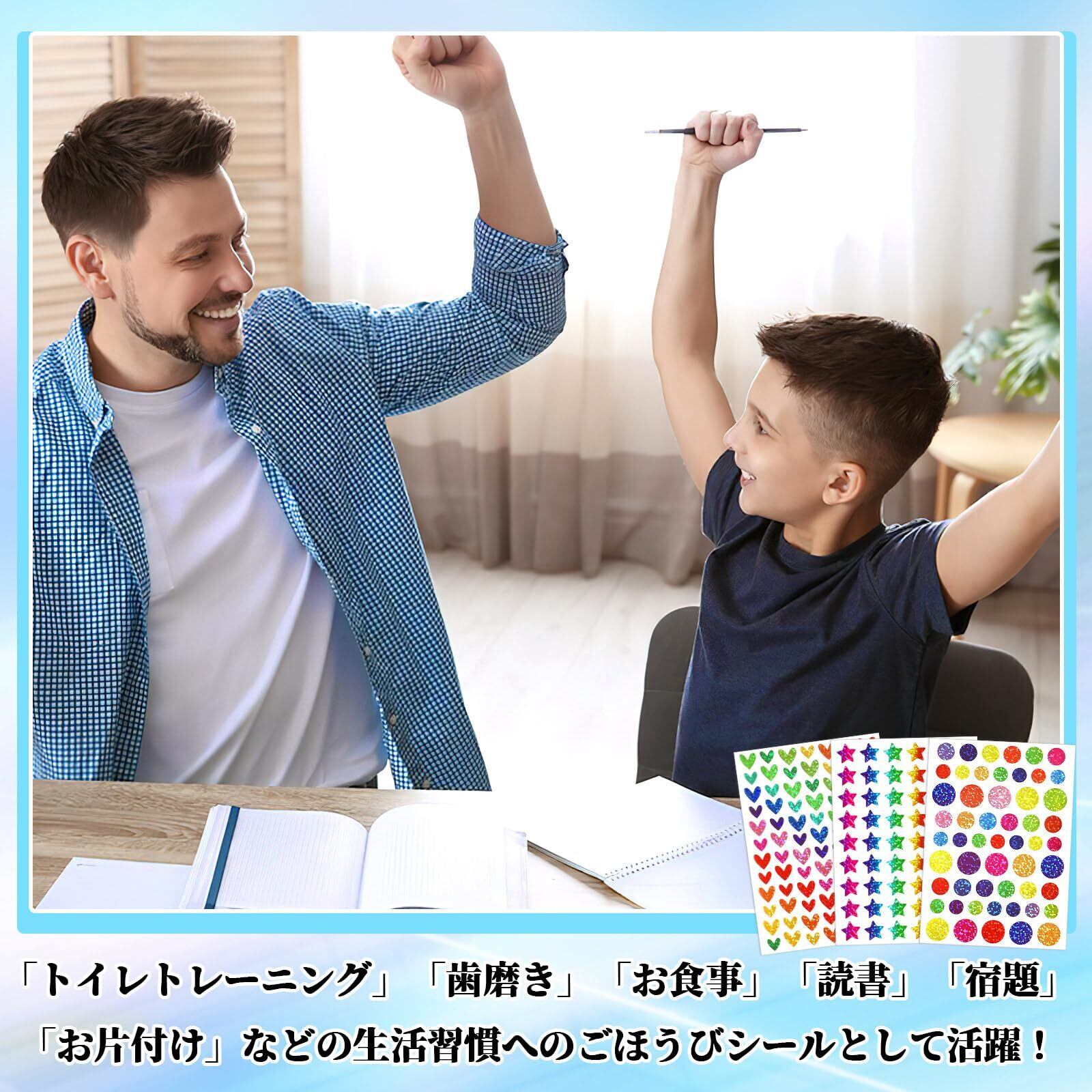 様々なシーンに:「トイレトレーニング」「歯磨き」「お食事」「読書」「宿題」「お片付け」などの生活習慣へのご褒美シールとしてよく使います。キラキラと輝き、カラフルで鮮やかな色合いなので、子供が喜ぶスタイルで、学校や病院、塾などでも大活躍します。また、手帳やノート、スケジュール、アルバムのデコシールにもを勧めします