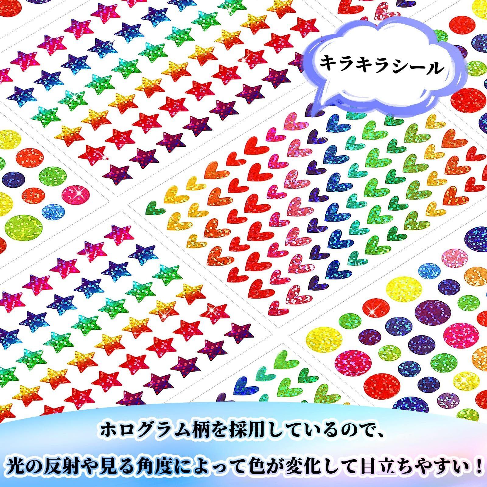キラキラシール:星 シール、ハート シール、丸シール、3種類のデザインがあります。ホログラム柄を採用しているので、光の反射や見る角度によって色が変化して目立ちやすいです