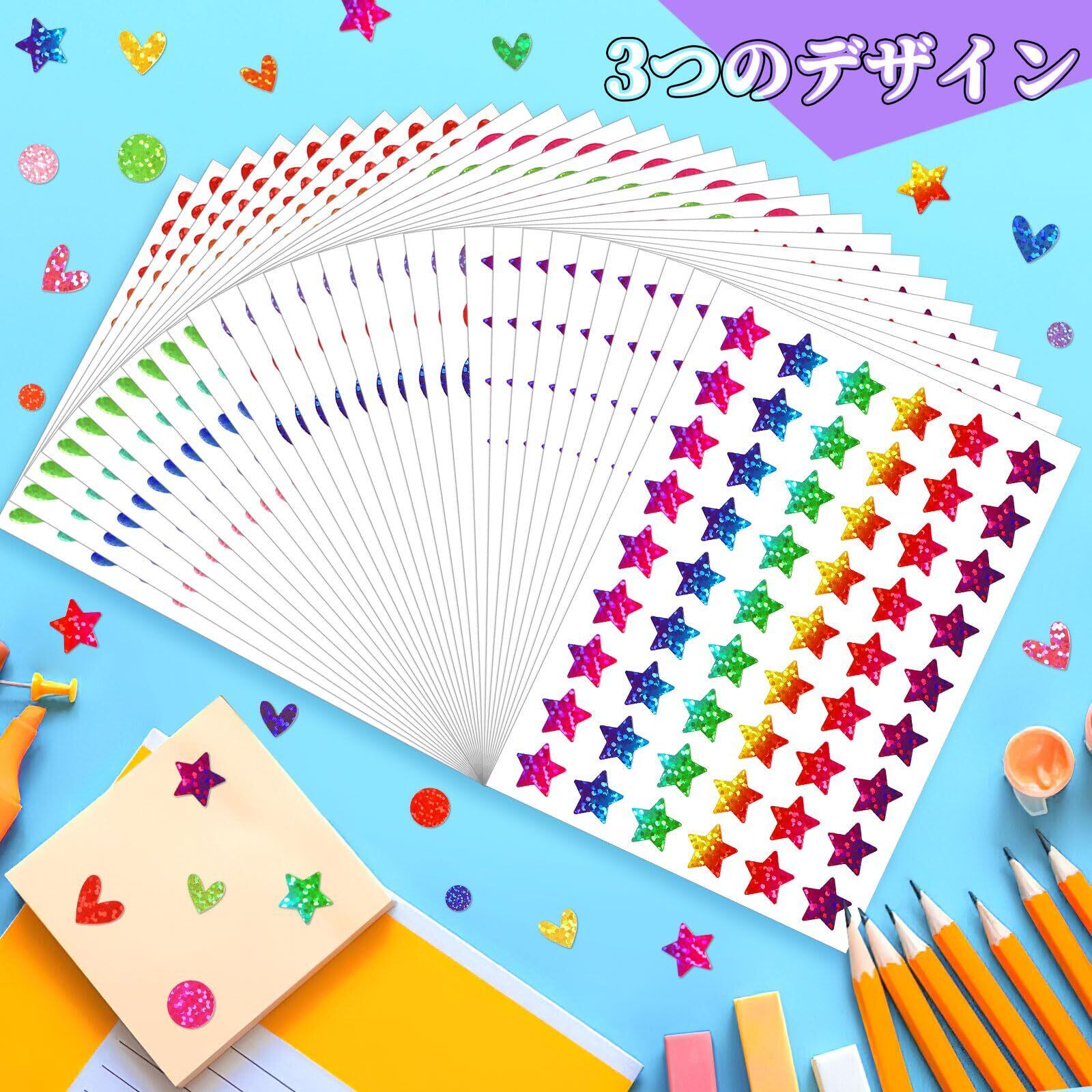 大容量:パッケージには合計30シートのキラキラシールが入っています。星、ハート、円型、3種類のデザインが用意しており、各デザインに10シート、合計1710片があります。大量なシールセットなので、ニーズによって自由に利用していただけます