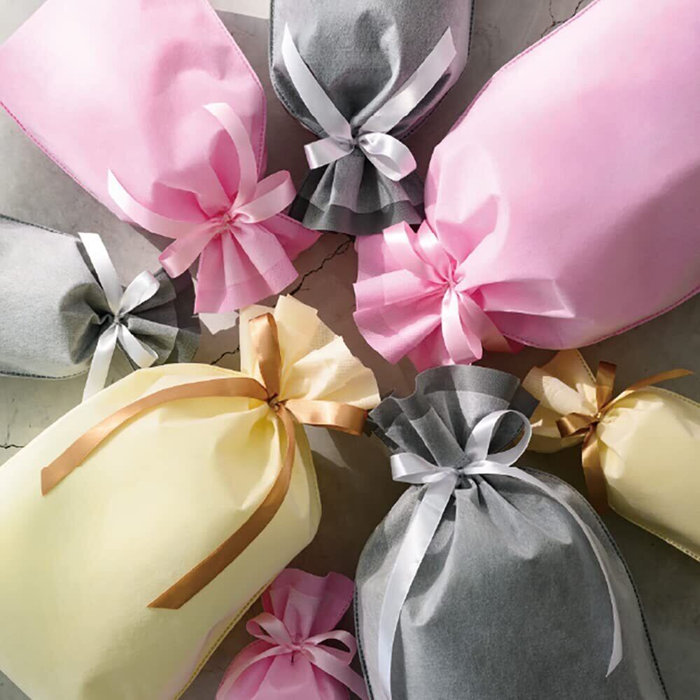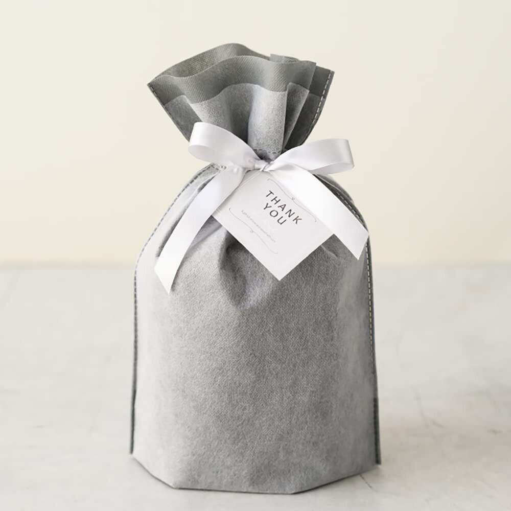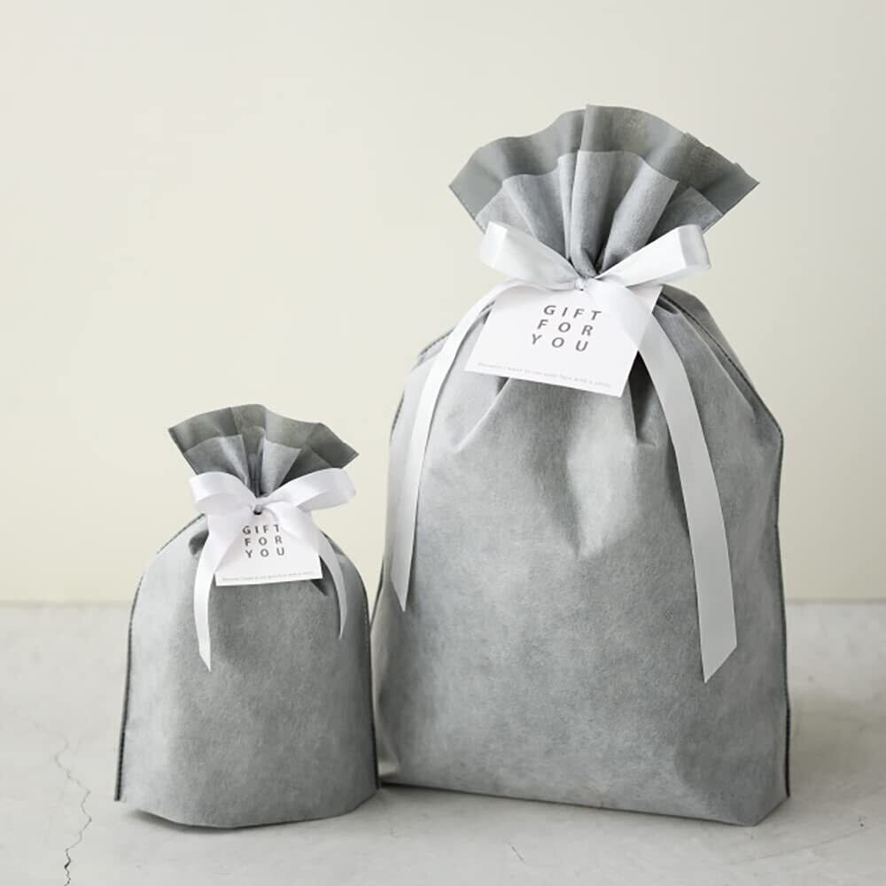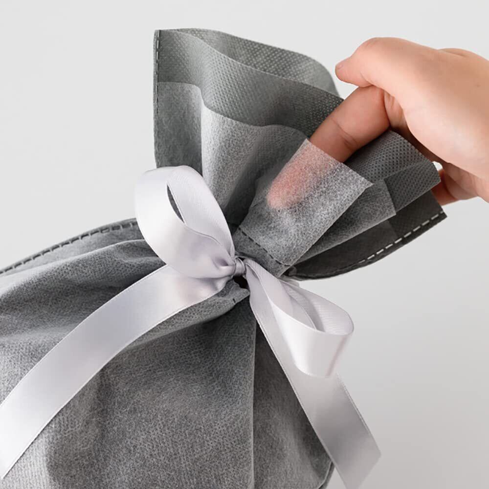 グレーの無地の無地のリボン付巾着バッグです。ベースのグレーの不織布に薄手の白の不織布を重ねることにより、シンプルながら上品で高級感のあるギフトバッグに仕上げました。