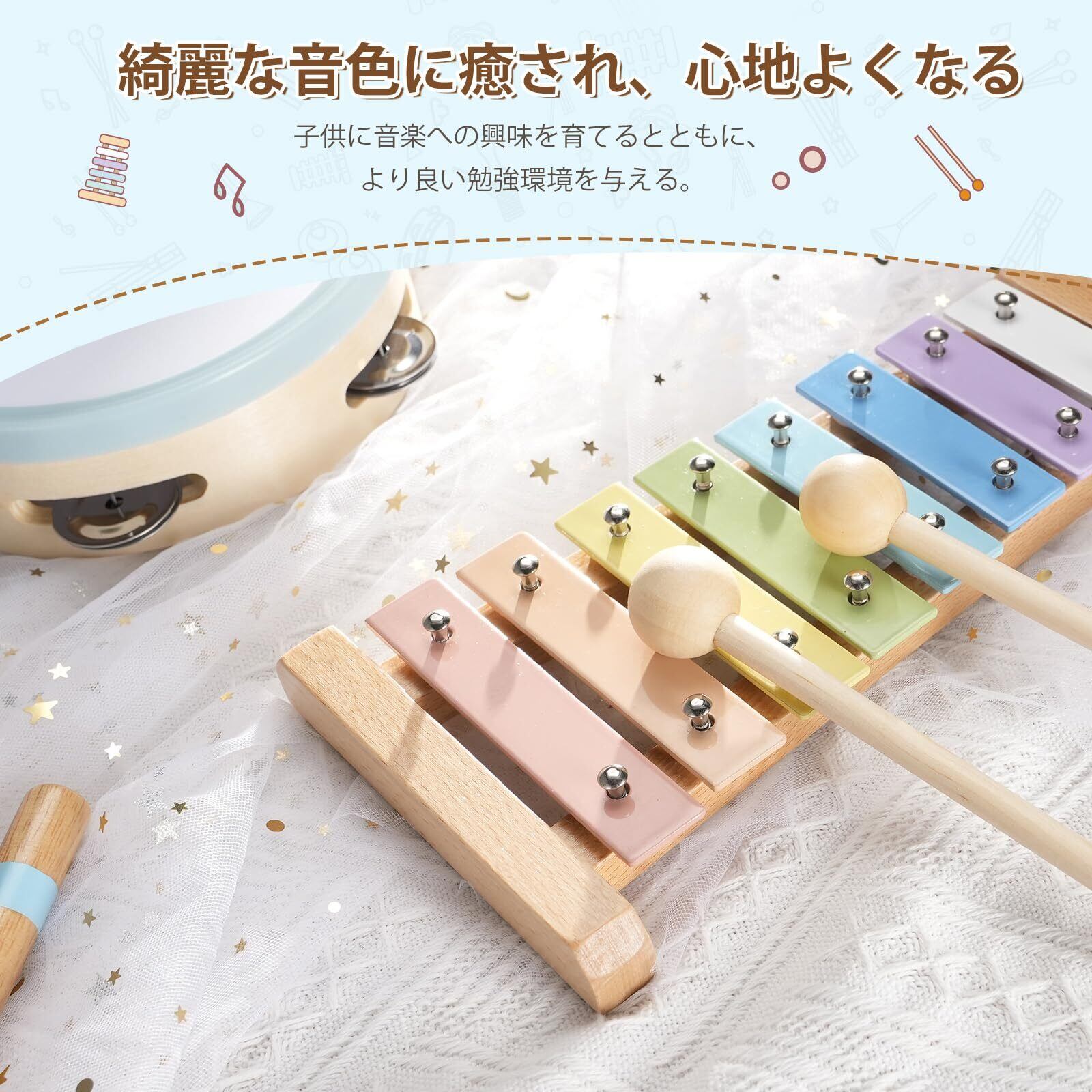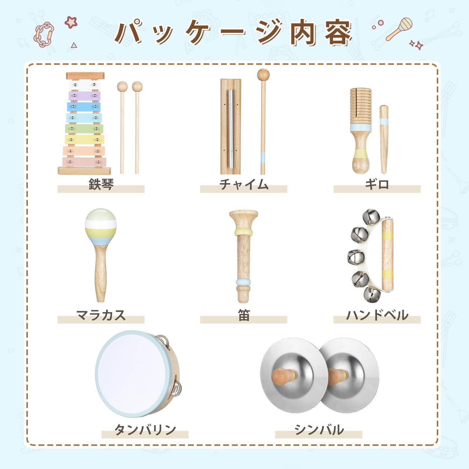 【多彩な8種類の楽器セット】タンバリン、鉄琴、ギロ、マラカスなど、8種類の楽器がセットになっています。さまざまな音色を楽しめるため、子どもたちの音楽的な好奇心を刺激します。
