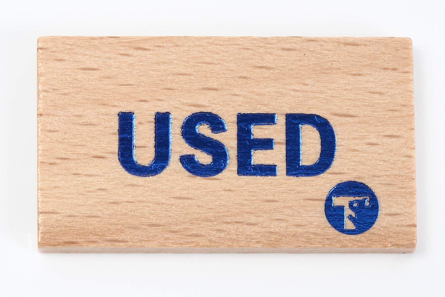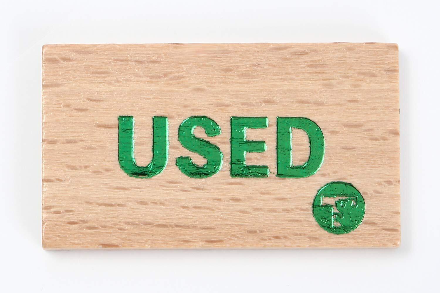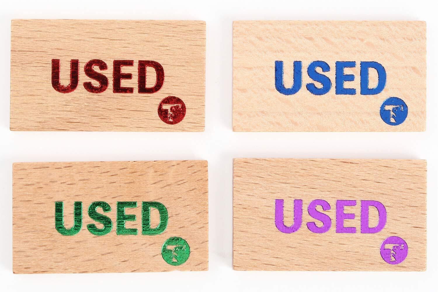 【商品名】 TOYGER USEDマーカー 4枚入り 木製 【商品説明】 大きさ:縦2cm×横3.5cm×厚さ3mm 素材:木製 内容量:4枚入り (レッド、ブルー、グリーン、パープルの4色) デザイン:TYPE 1 (USED)