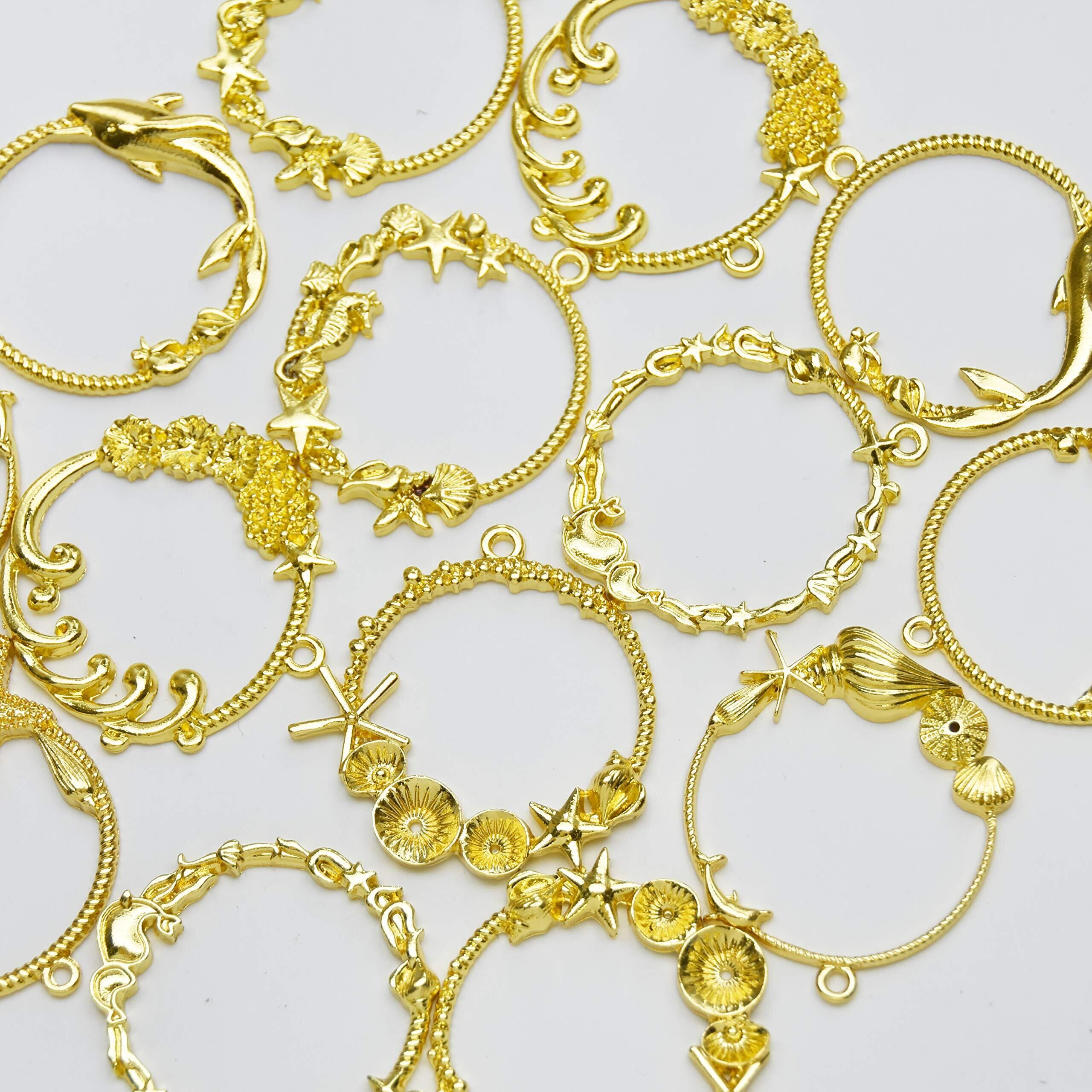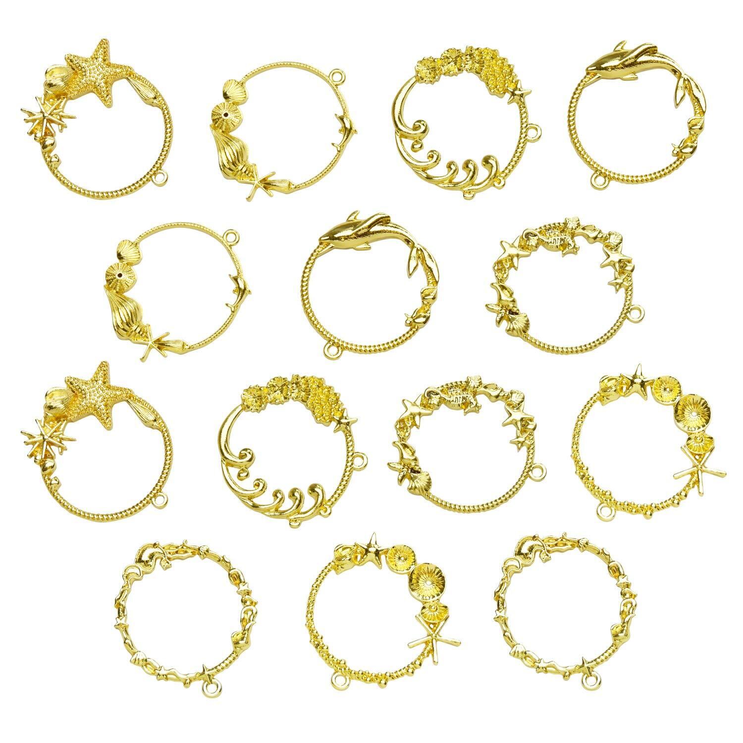 レジン枠 空枠 フレーム MUNCVY パーツ ゴールド 7種14個 セット uvクラフト 大量 カン付き ラウンド型 マリンモチーフ 海 イルカ ヒトデ 波 美しい セッティング アクセサリーパーツ から枠