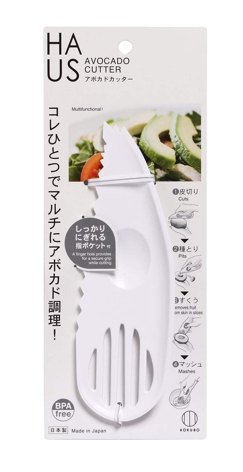 【商品名】 KOKUBO(コクボ) 小久保工業所 HAUS アボカドカッター KK-419 【商品説明】 小久保工業所 HAUS アボカドカッター KK-419 ◎これ一つでアボカドを「切る」「種をとる」「皮をむく」「つぶす」の4通り調理できる。◎しっかりにぎれる指ポケット付き。