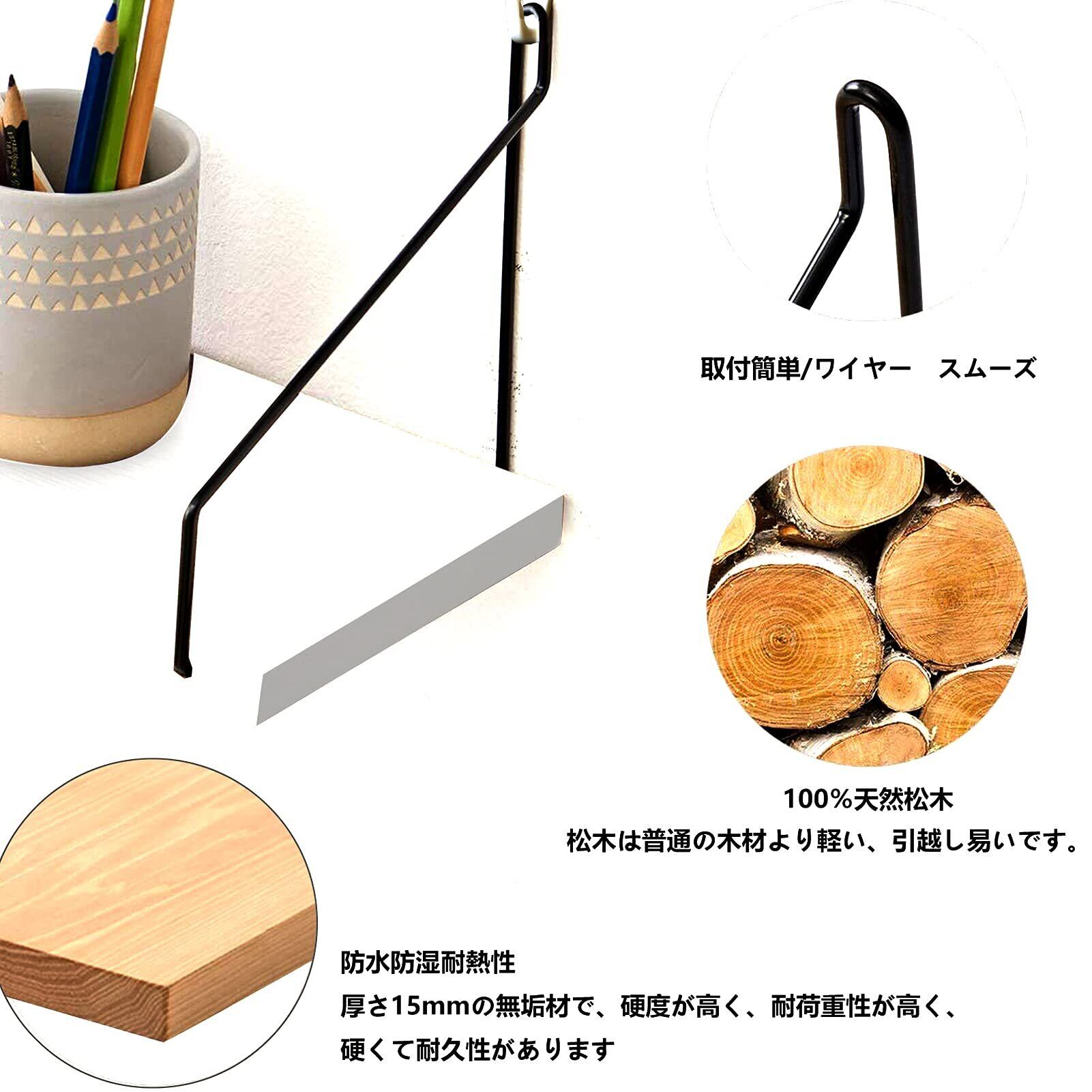 ウォールシェルフ 天然木 壁掛け棚 取付簡単 本棚 DIY 木製 飾り棚 シンプル ワイヤー付け 収納便利 (ホワイト, 40cm)