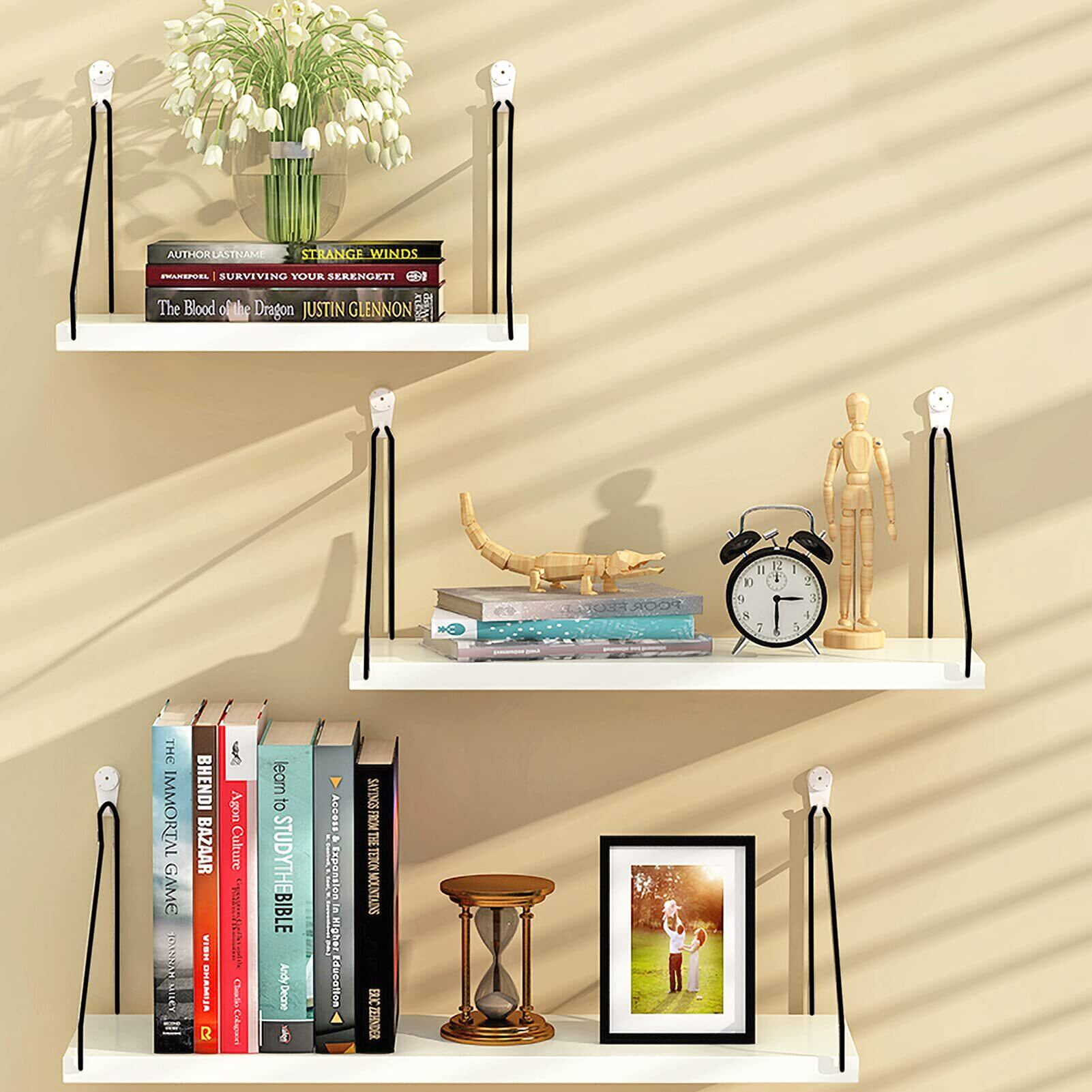 【努力特価】ウォールシェルフ 天然木 壁掛け棚 取付簡単 本棚 DIY 木製 飾り棚 シンプル ワイヤー付け 収納便利 (ホワイト, 40cm)