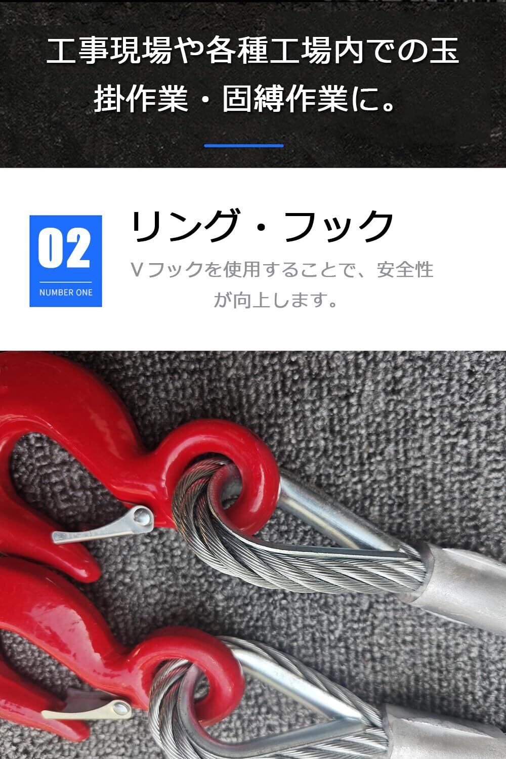 【安全なフック】統合ラッチ、フック先端と連動し、11mmワイヤーを採用し、2tの荷重安全性を実現します。