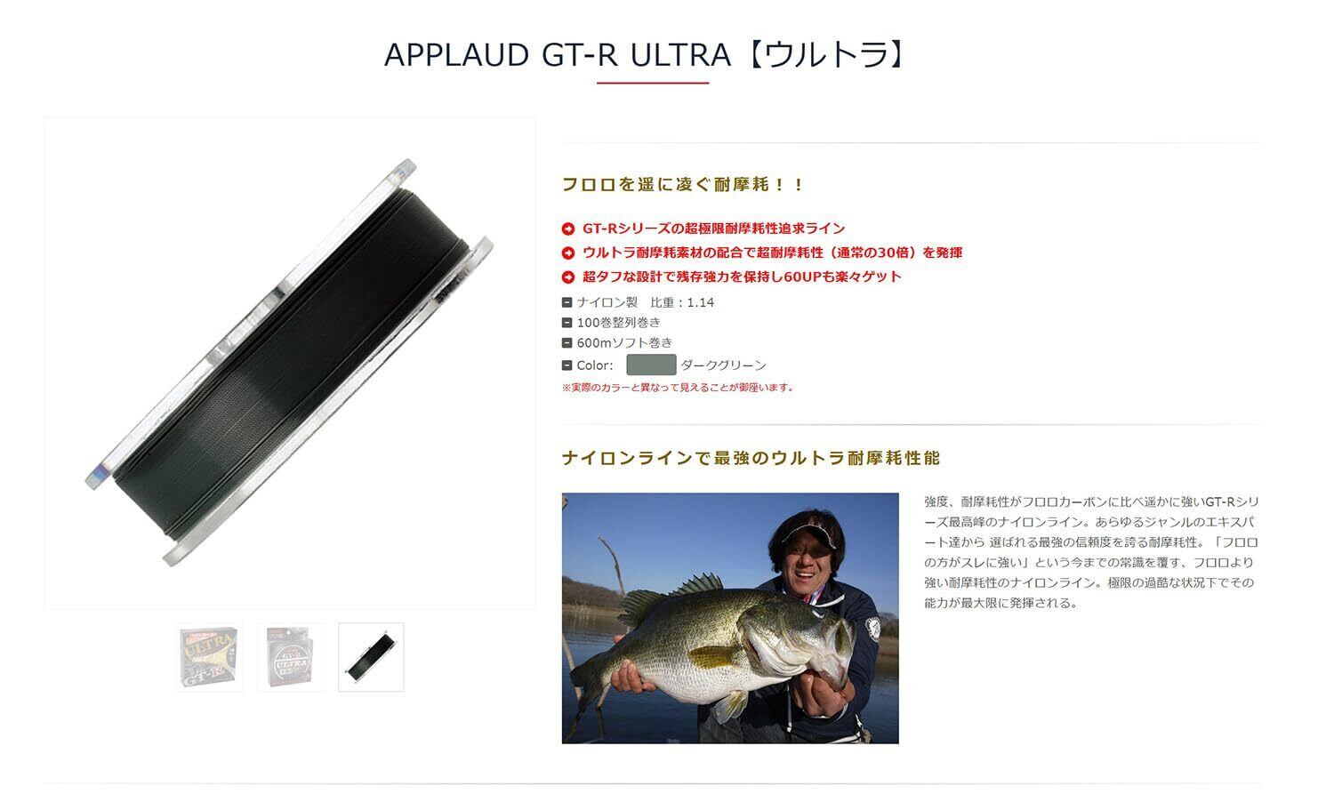 【商品名】 サンヨーナイロン ライン アプロードGT-R ULTRA 75m 【商品説明】 主な対応魚種:ブラックバス 主な釣法:バス 素材:ナイロン 全長:75m / 強度:22lb カラー:ダークグリーン 比重:1.14 強度・耐摩耗性がフロロカーボンに比べ遥かに強いGT-Rシリーズ最高峰のナイロンラインです。「フロロの方がスレに強い」という今までの常識を覆すフロロより強い耐摩耗性。