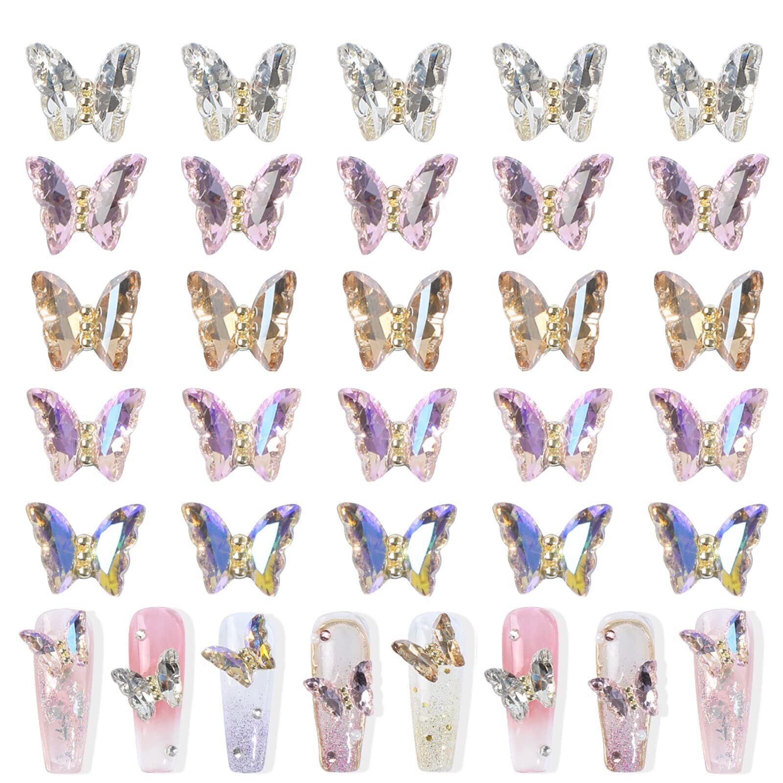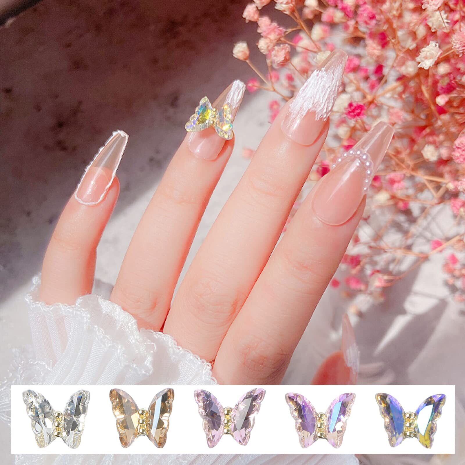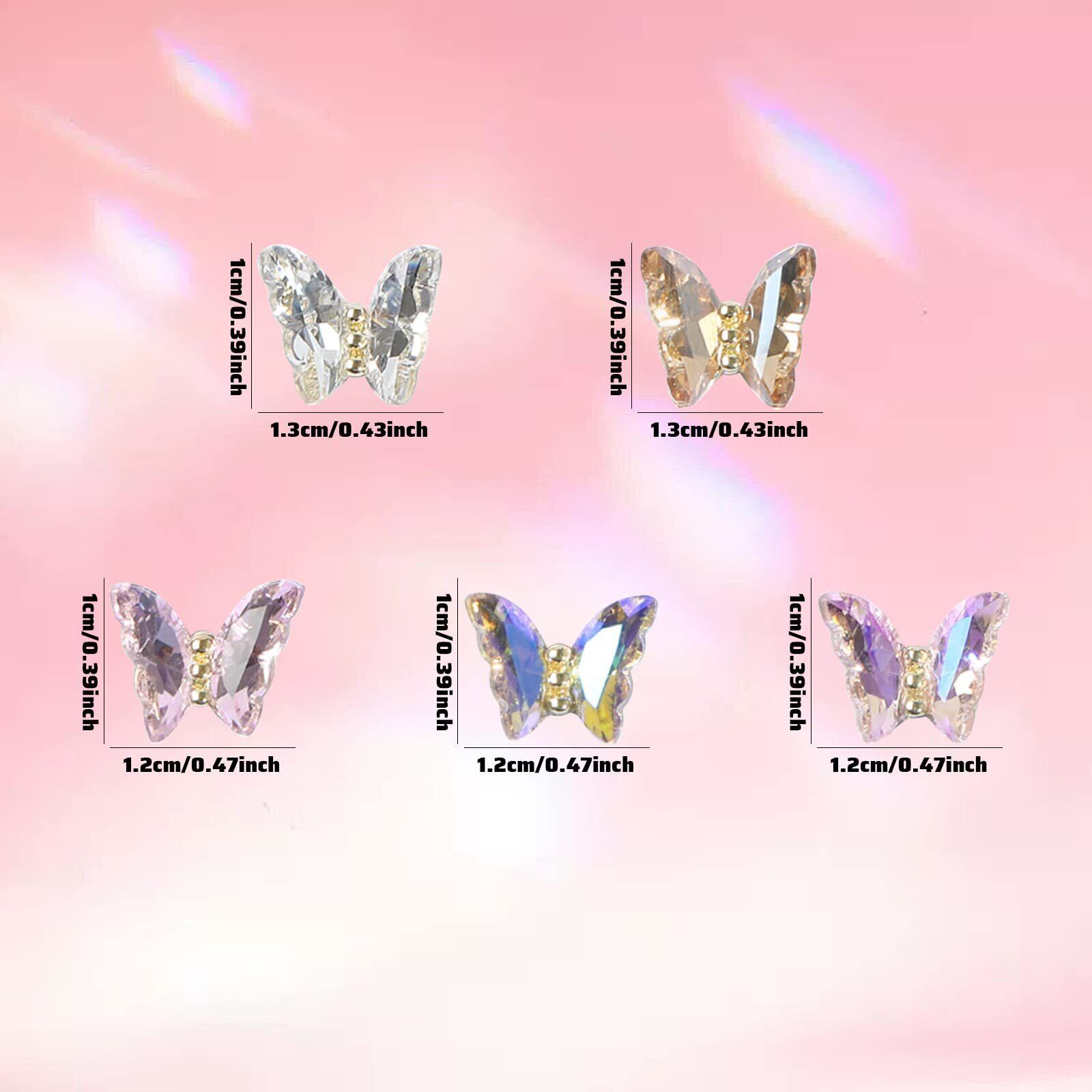 【 パッケージ】クリスタルバタフライのネイルアートアクセサリー25個セット、毎日のネイルアートのデコレーションに必要な十分な量とさまざまなカラーがあります。 シルバー、シャンパン、ピンク、オーロラピンク、オーロラパープルの5色です。