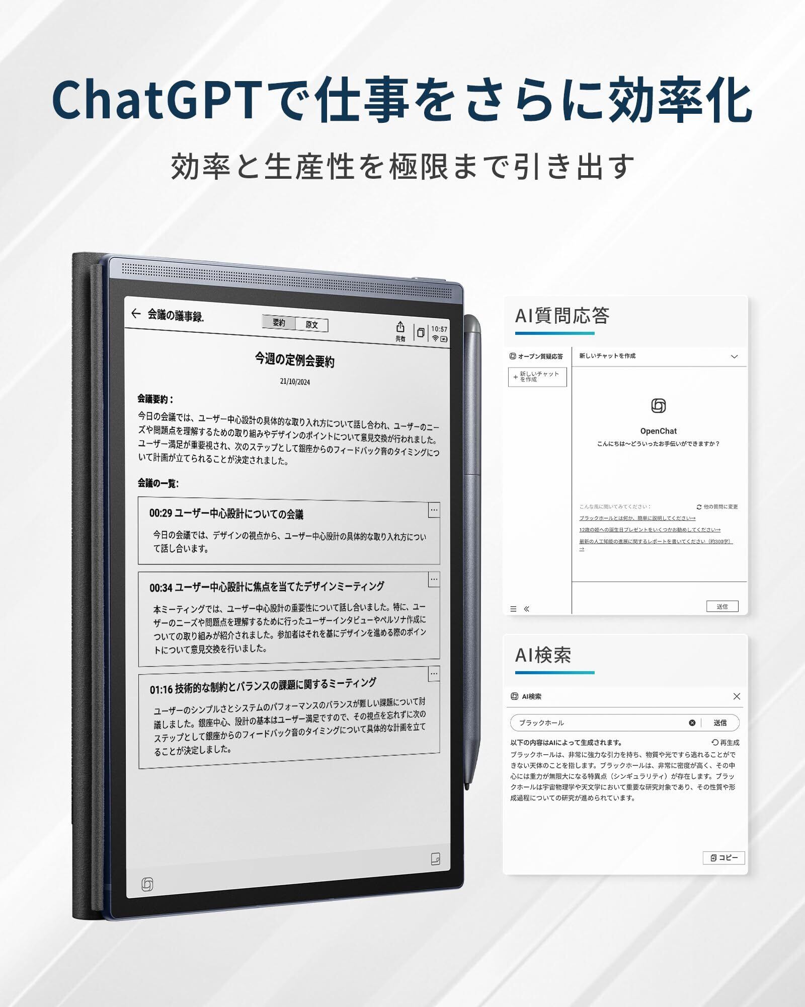【ChatGPTで仕事をさらに効率化】ChatGPTと連携して、会議がもっとスムーズに、もっと効率的になります。まるで専属アシスタントがサポートしてくれるように、会議メモを瞬時に整理・議事録作成します。重要なポイントを一発で抽出して、参加者にすぐシェアできます。