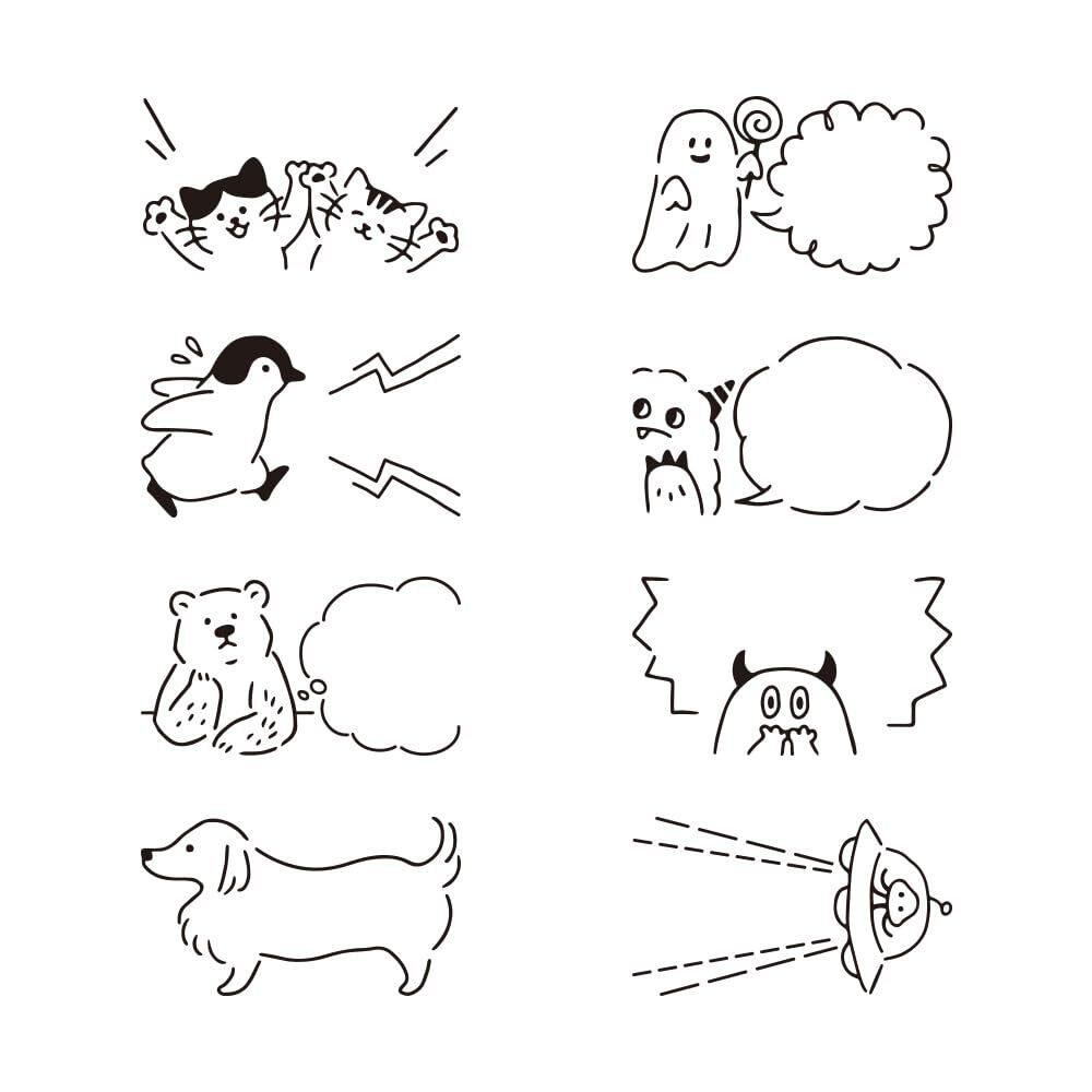 使いやすい動物モチーフにくわえて、オバケや宇宙人なども組み合わせた、とてもユニークな吹き出し柄です。