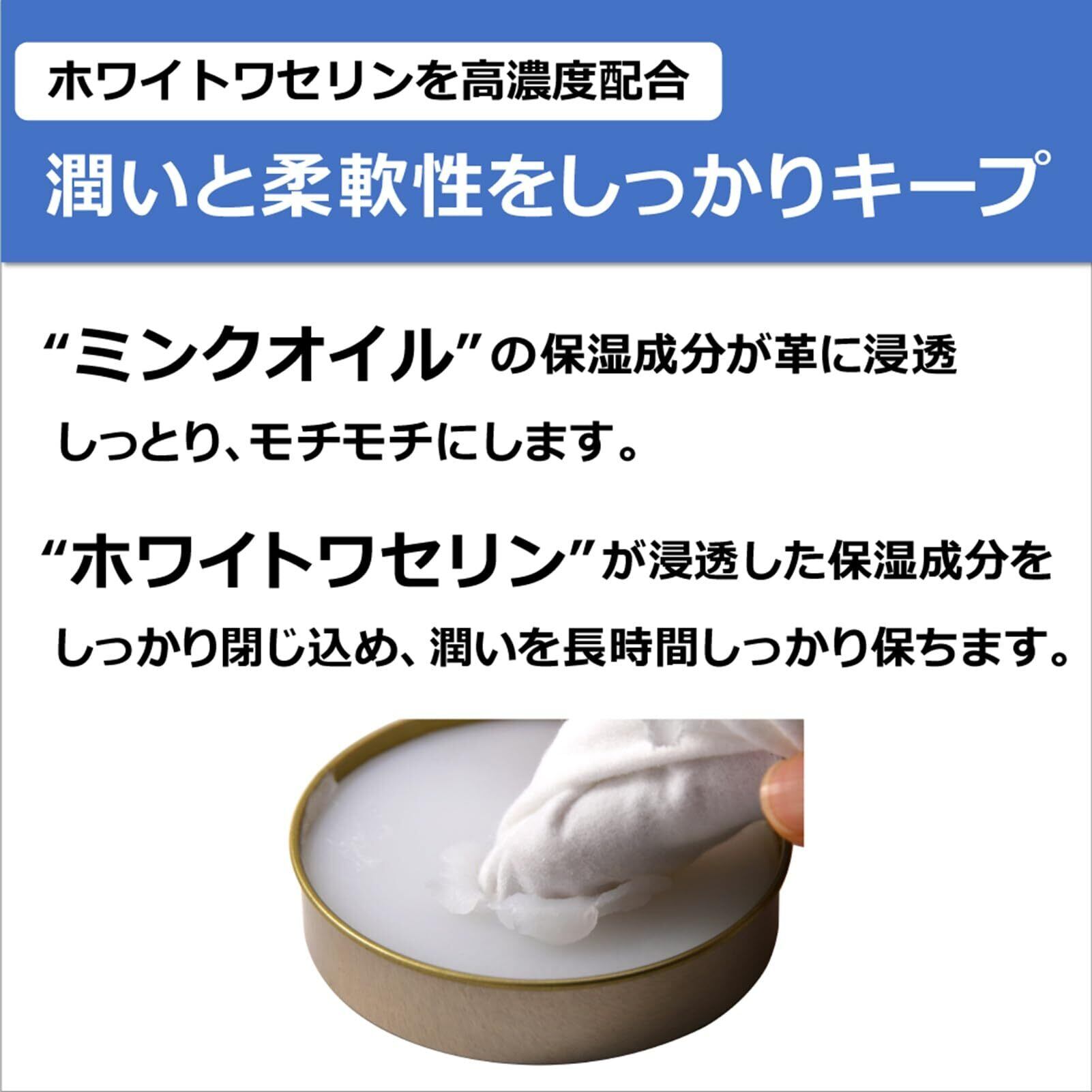 【潤いと柔軟性が復活!】浸透力の強いミンクオイルの栄養効果と、ワセリンの保湿効果で、革製品をしっとり柔らかくし、防水効果も与えます。大切な革製品を長く愛用するための必需品です。