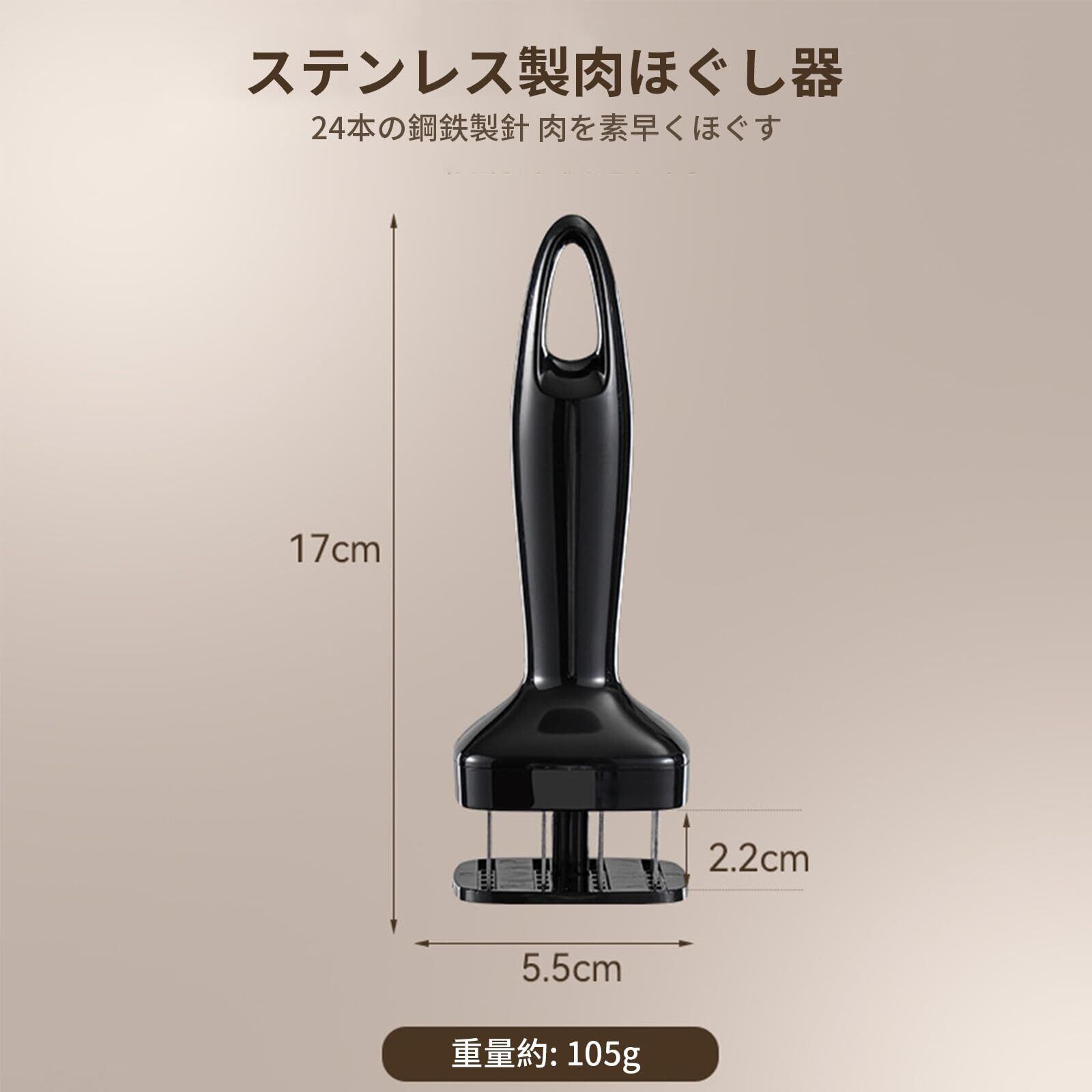 【厳選された素材】このミートルーザーはステンレス鋼の針と高品質のABSプラスチックで作られており、安全で衛生的です。 一方、ステンレス鋼プレスオン肉ルーザーは非常に耐久性があり、長期間の使用後でも変形したり、錆びることは容易ではありません。 【人間工学に基づいたデザイン】ちょうど良いカーブを描く滑らかなハンドルは、片手で持ちやすいデザインです。 ハンドルの先には吊り下げ用の穴があり、キッチンフックに掛けられるので場所を取らず、収納も簡単です。 【使いやすい】自動リバウンド機能付きバネを内蔵し、持ち上げるとミートローザーが自動的に収納され、危険の心配がありません。 また、お手入れも簡単で、洗剤に数分間浸してからブラシで洗うことができます。 【時間短縮】ミートローサーを使用すると、肉が内部で細かく切断されるため、熱が均等に分散され、調理時間が短縮されます。 肉がやわらかくなるだけでなく、調味料が肉の奥まで浸透しておいしくなる。 【適用範囲】牛肉、豚肉、鶏肉、その他どんな肉にも適しており、押すだけで簡単に肉を柔らかくすることができます。 キッチン、ホテル、レストランなどの日常生活に適しています。
