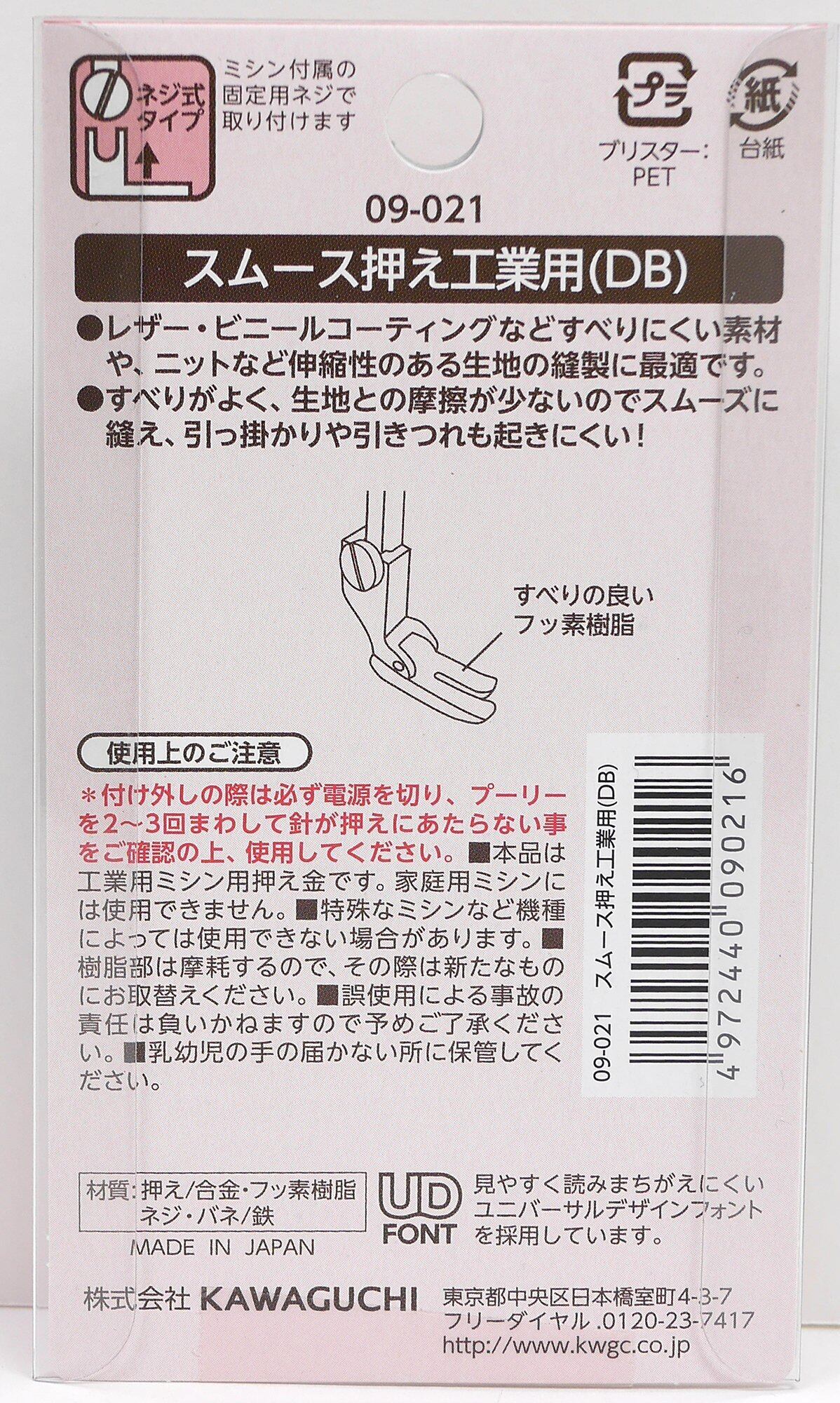 【商品名】 KAWAGUCHI(カワグチ) 手芸用品 スムース押え工業用(DB) 09-021 【商品説明】 【素材】押え:合金・フッ素樹脂 、ネジ・バネ:鉄 レザー・ビニールコーティングなど、すべりにくい素材や、ニットなど伸縮性のある生地の縫製に最適