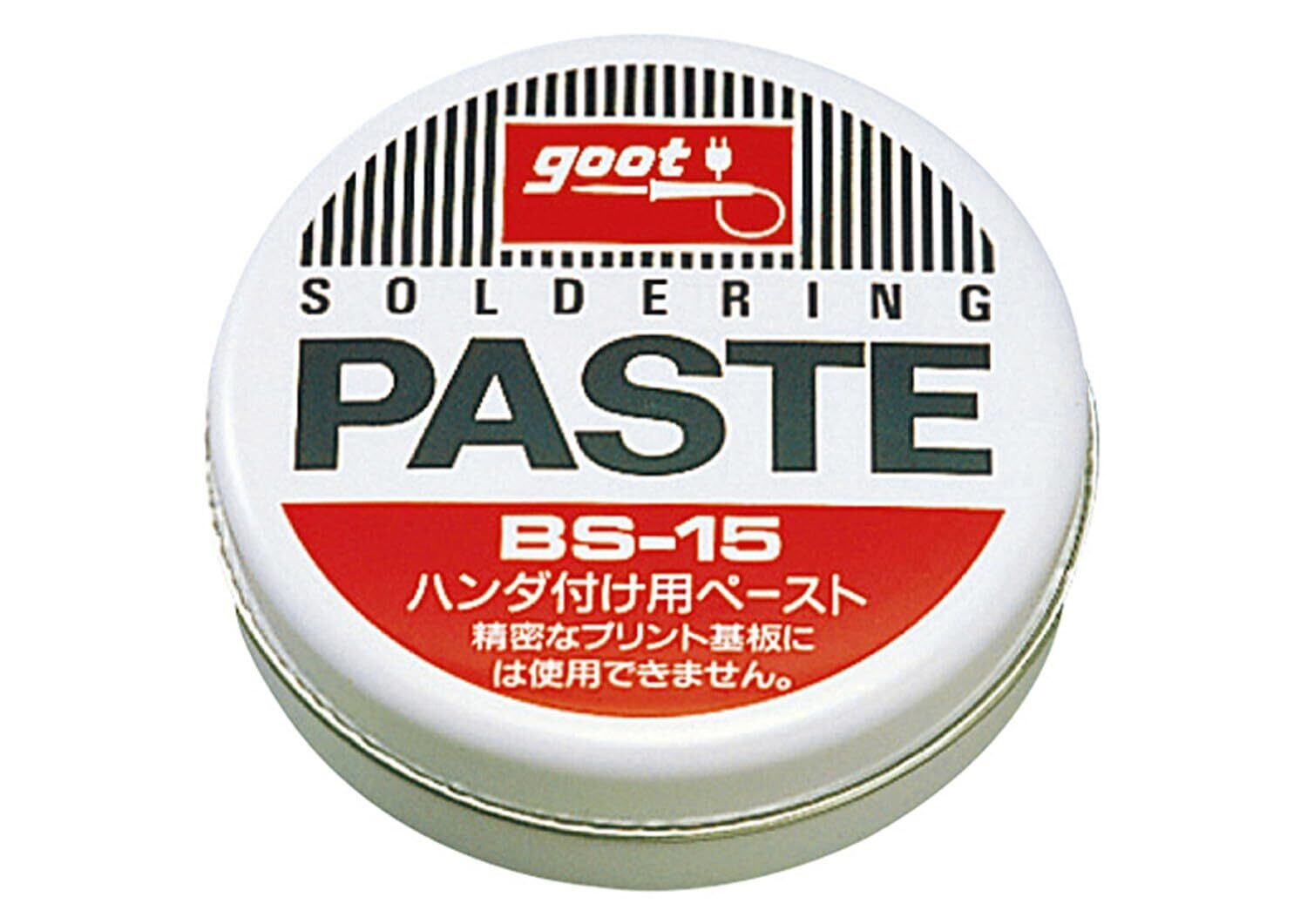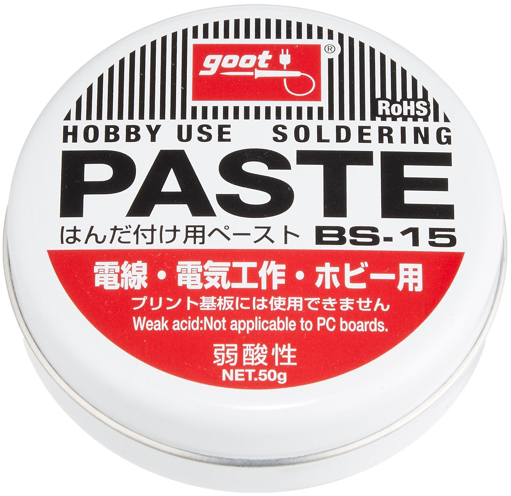 【商品名】 太洋電機産業(goot) ペースト 50G BS-15 【商品説明】 製造国:日本 RoHS2適合品 成分:ワセリン 80~90wt%、塩化亜鉛 4~6wt%、水分:2~4wt%、ラフィン6~9wt%、塩化アンモニウム 1~3wt% 容量:50g RoHS対応品 ホビー用ペースト:50g より ●ホビーや電子工作にぴったりなはんだ付け促進剤