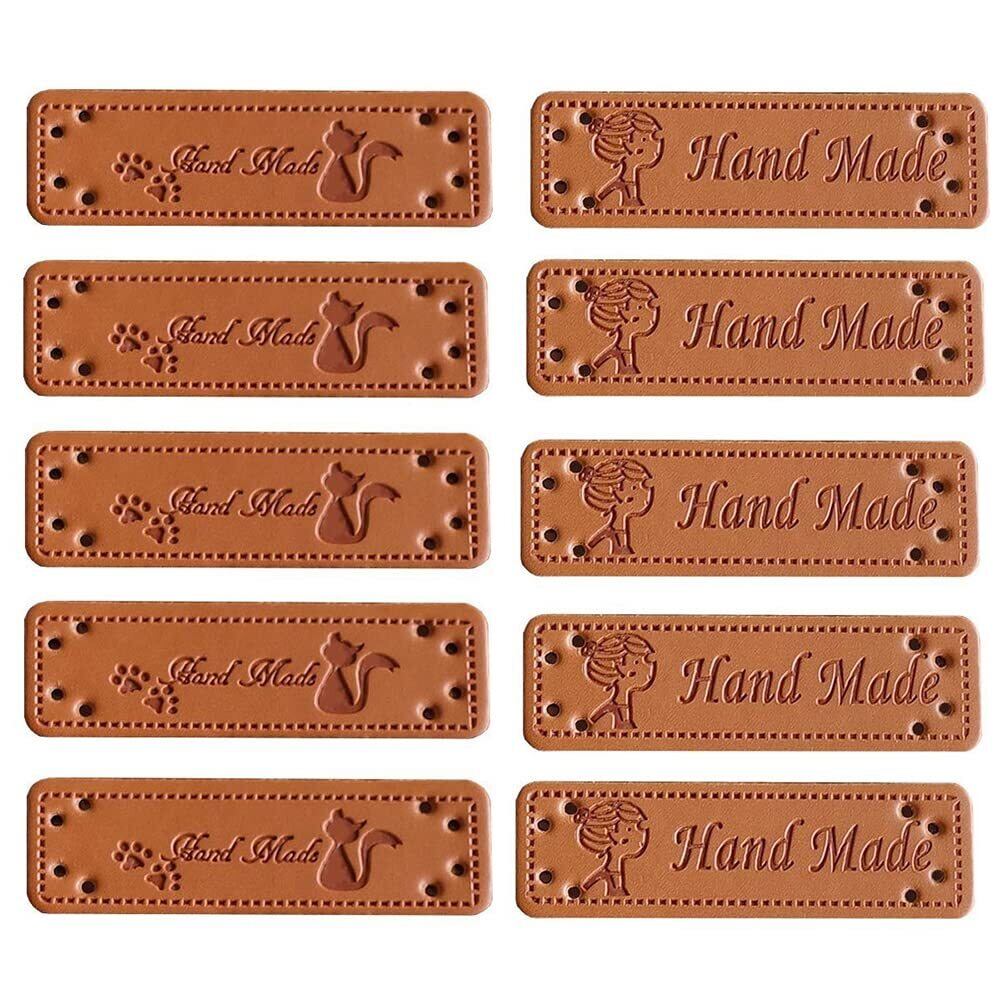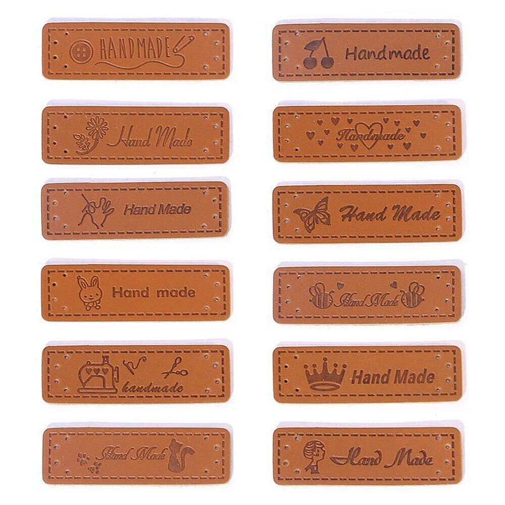 【在庫のみ】革タグ 60枚入り 12種パターン レザータグ 革ラベル 刺繍タグ 合皮タグ 長方形 穴あき 英文柄 Handmade ワッペン ラベル タグ 手芸 縫製 DIY ハンドメイド 手作り ニット帽/衣類/バッグ用 装飾 飾り
