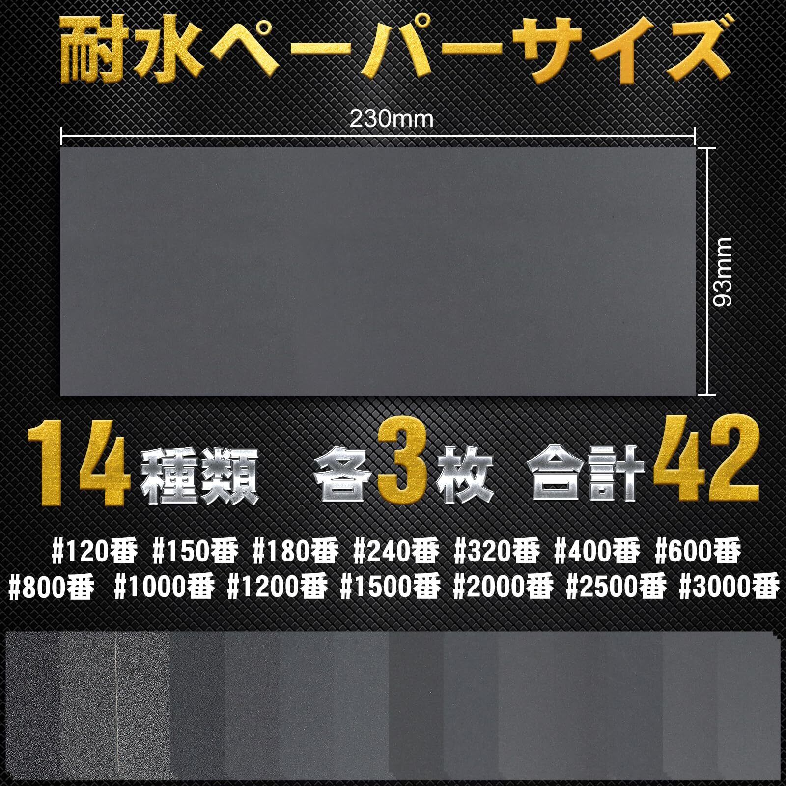耐水ペーパー セット 120 150 180 240 320 400 600 800 1000 1200 1500 2000 2500 3000番号(各3枚)、230mm×93mmのサンドペーパーが42枚入っており、数字が小さいほど表面が粗く、数字が大きいほど表面が細かくなります