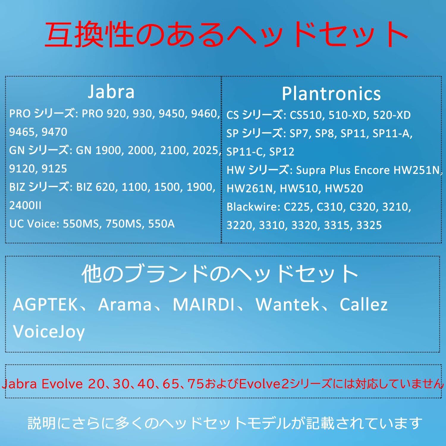 【互換可能なヘッドセット】 Jabra Evolve 20、30、40、65、75およびEvolve2シリーズには対応していません。Jabra PRO 920、930、9450、9460、9465、9470、BIZ 620、1100、1500、1900、2300、2400II、GN 1900、2000、2100、2025、9120、9125、UC Voice 550、750MS、Plantronics Supra Plus Encore HW251N、HW261N、HW510、HW520、Blackwire C225、C310、C320、3210、3220、3310、3320、3315、3325など、特定のヘッドセットモデルのみに互換性があります。その他のヘッドセットについては、互換性ガイドを参照してください。