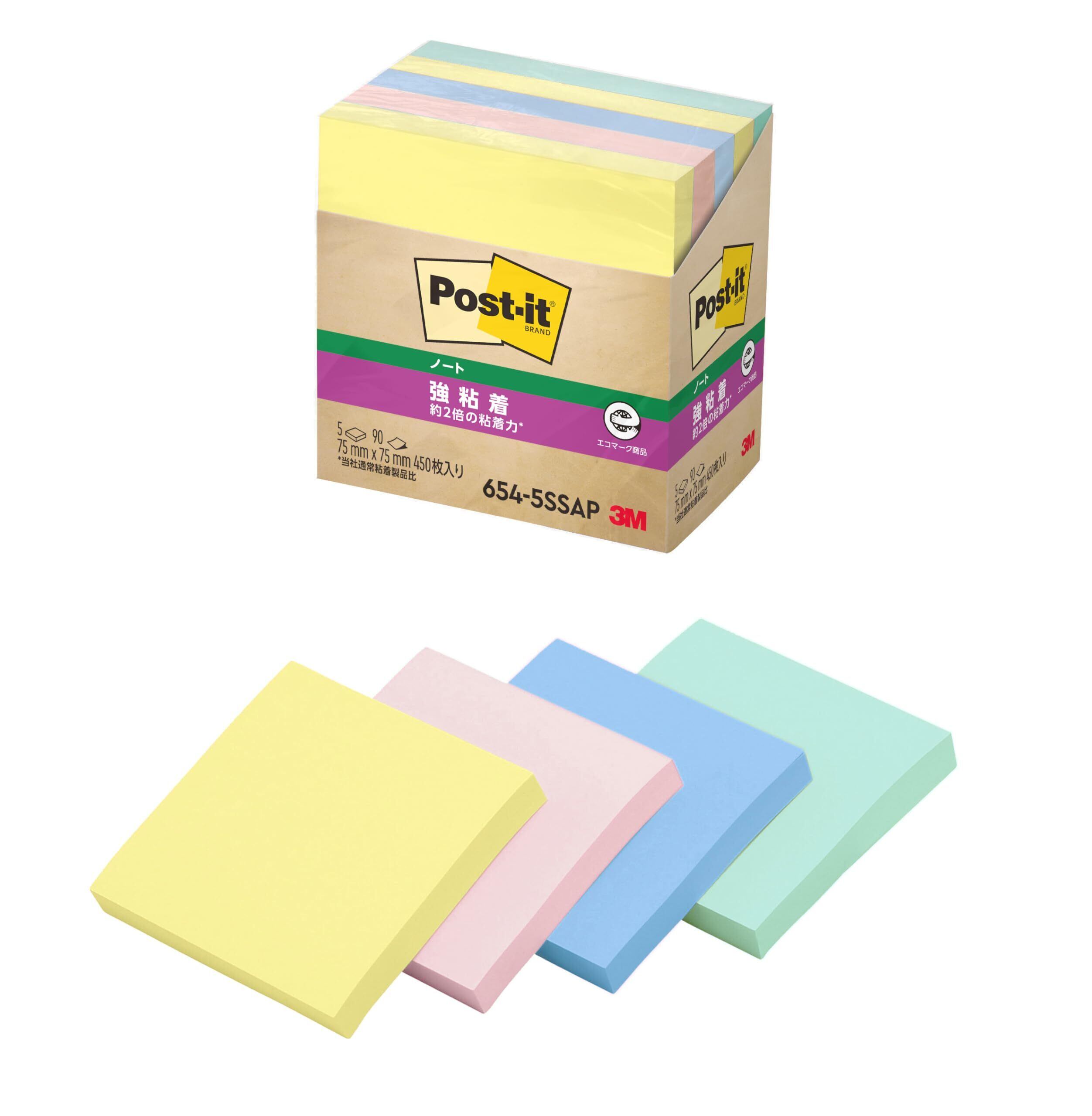 【数量限り】ポストイット 付箋 正方形 強粘着 ノート パステルカラー 75×75mm 90枚×5冊 654-5SSAP