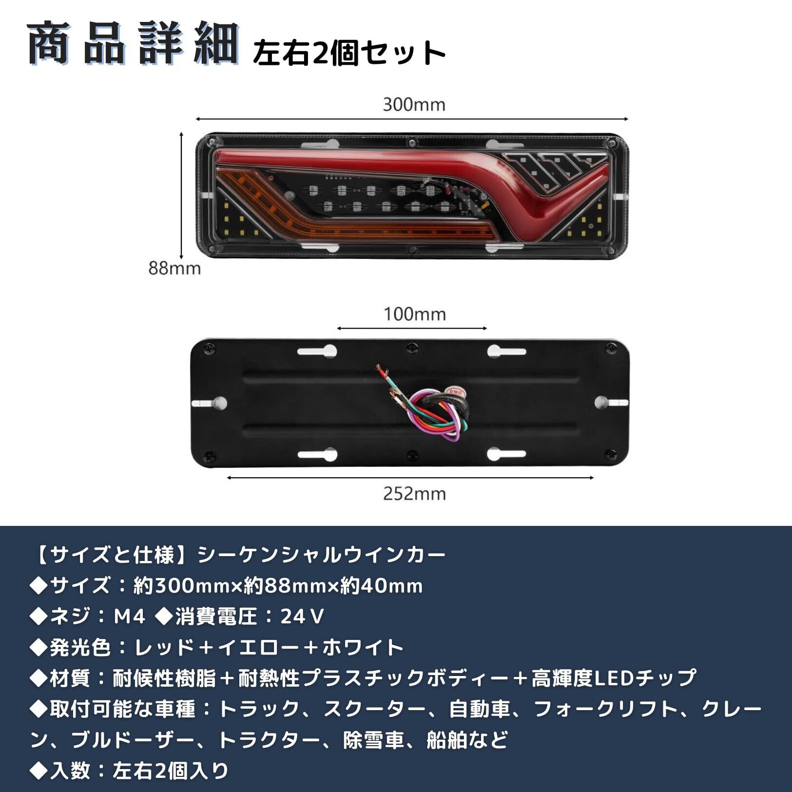 【サイズと仕様】シーケンシャルウインカー ◆サイズ:約300mm×約89mm×約40mm ◆ネジ:M4 ◆消費電圧:24V ◆発光色:レッド+イエロー+ホワイト ◆材質:耐候性樹脂+耐熱性プラスチックボディー+高輝度LEDチップ ◆取付可能な車種:トラック、スクーター、自動車、フォークリフト、クレーン、ブルドーザー、トラクター、除雪車、船舶など◆入数:左右2個入り
