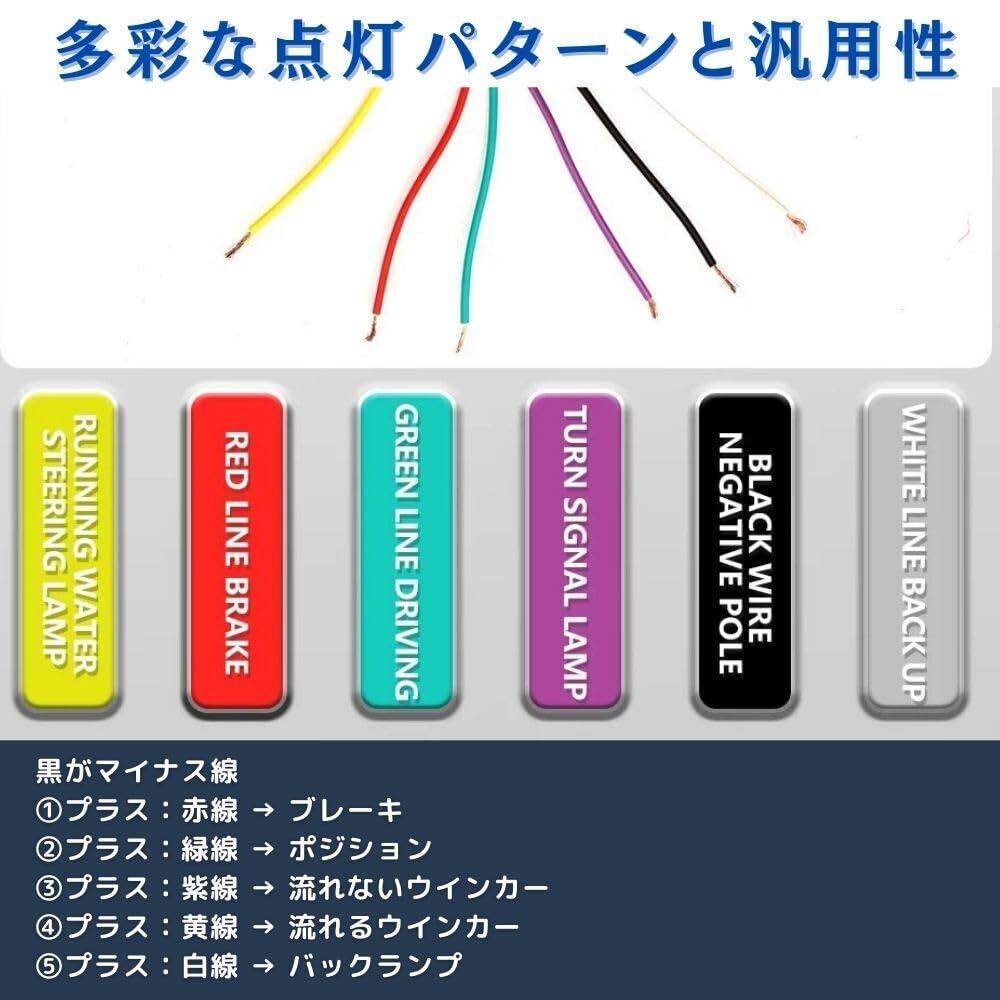【多彩な点灯パターンと汎用性】6本の電線を備えており、配線を変更することで「流れる」ウインカーや「流れない」ウインカーなど、さまざまな点灯パターンを設定できます。※黒がマイナス線です。①プラス:赤線 → ブレーキ ②プラス:緑線 → ポジション ③プラス:紫線 → 流れないウインカー ④プラス:黄線 → 流れるウインカー ⑤プラス:白線 → バックランプ。