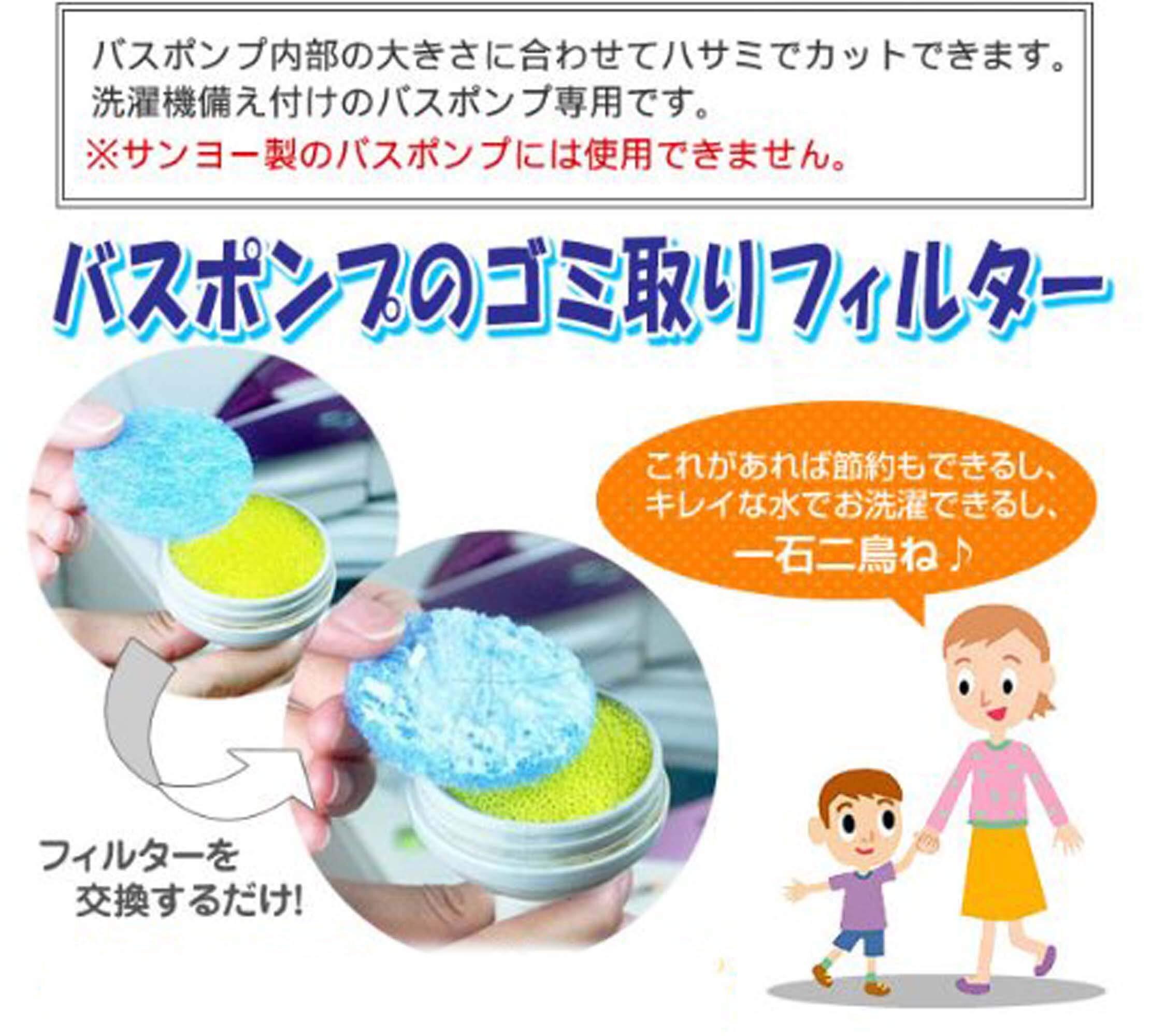 バスポンプの替えフィルターです。お風呂の残り湯内のゴミ・髪の毛などが洗濯機に進入するのを防ぐ!バスポンプの汚れ・詰まりが取替えるだけで解消!さらに抗菌・防カビ配合素材で安心です。
