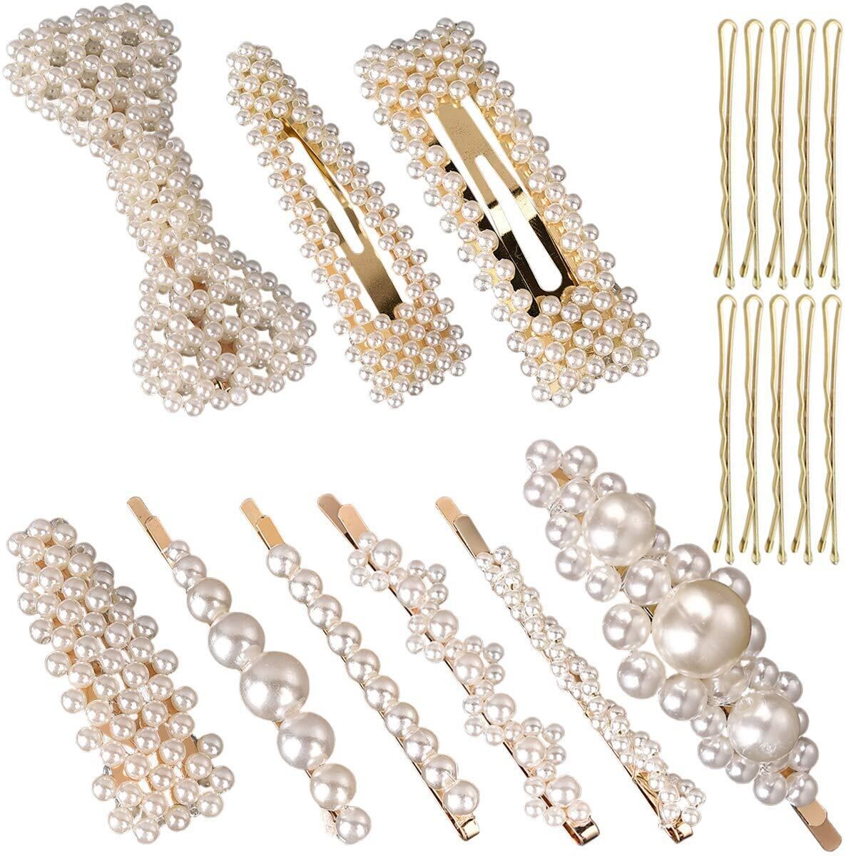 【在庫処分】ヘアクリップ パール(19本セット) ヘアピン ヘアアクセサリー リボン 髪留め 髪飾り パッチン留め 髪 ピン セット 髪束ね 前髪 ヘアアレンジ ゴールドピン