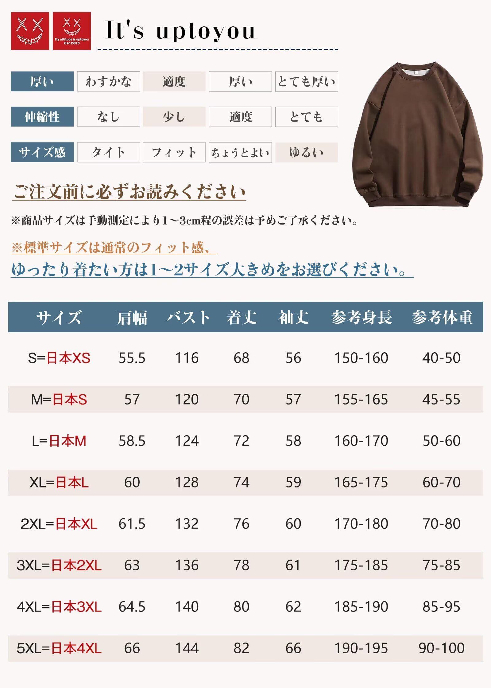 【S=日本XS】推奨体重:40-50kg 身長の目安:150-160cm【M=日本S】推奨体重:45-55kg 身長の目安:155-165cm【L=日本M】推奨体重:50-60kg 身長の目安:160-170cm【XL=日本L】推奨体重:60-70kg 身長の目安:165-175cm【2XL=日本XL】推奨体重:70-80kg 身長の目安:170-180cm【3XL=日本2XL】推奨体重:75-85kg 身長の目安:175-185cm【4XL=日本3XL】推奨体重:85-95kg 身長の目安:185-190cm【5XL=日本4XL】推奨体重:90-100kg 身長の目安:190-195cm