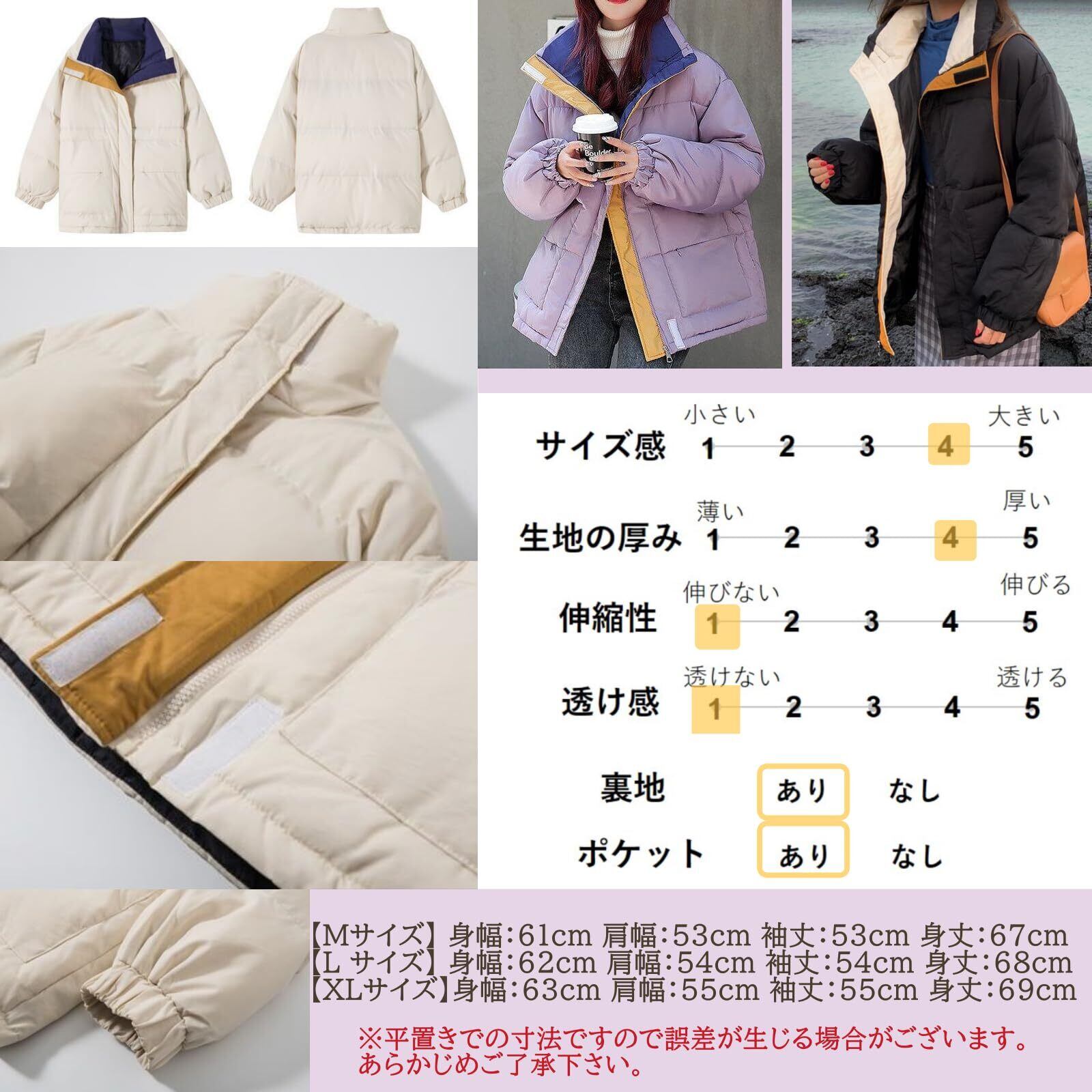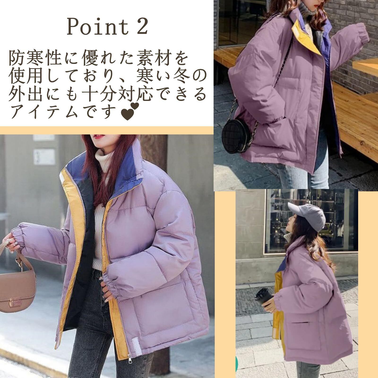 [カラー展開]このジャケットは3色のカラーバリエーションが用意されています。ホワイト:清潔感があり、どんなファッションにも合わせやすいベーシックなカラー。明るい色合いで冬のコーディネートに軽やかさをプラスします。パープル:優しく女性らしい印象を与えるカラー。個性的な色味ながら、落ち着いた雰囲気も持ち合わせているため、ファッションのアクセントに最適です。ブラック:定番かつシックなカラー。どんな場面でも活躍しやすく、スタイリッシュな印象を演出します。耐汚性も高く、アウトドアやアクティブなシーンでも便利です。