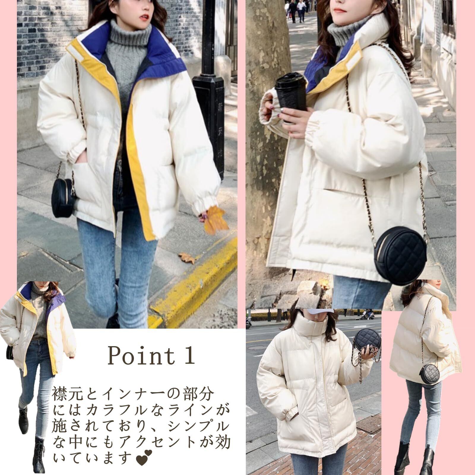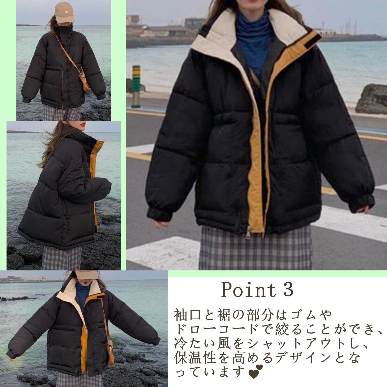 [デザインとスタイル]このジャケットは、ゆったりとしたシルエットが特徴的で、トレンド感と実用性を兼ね備えたカジュアルなデザインです。襟元とインナーの部分にはカラフルなラインが施されており、シンプルな中にもアクセントが効いています。寒い季節の防寒対策としてだけでなく、デイリーユースやちょっとしたお出かけ、アウトドアでも使える万能なアイテムです。ジッパーはフロントに大きく配置され、簡単に着脱できる仕様になっています。ボリューム感のあるシルエットが、動きやすさとファッション性を両立させています。