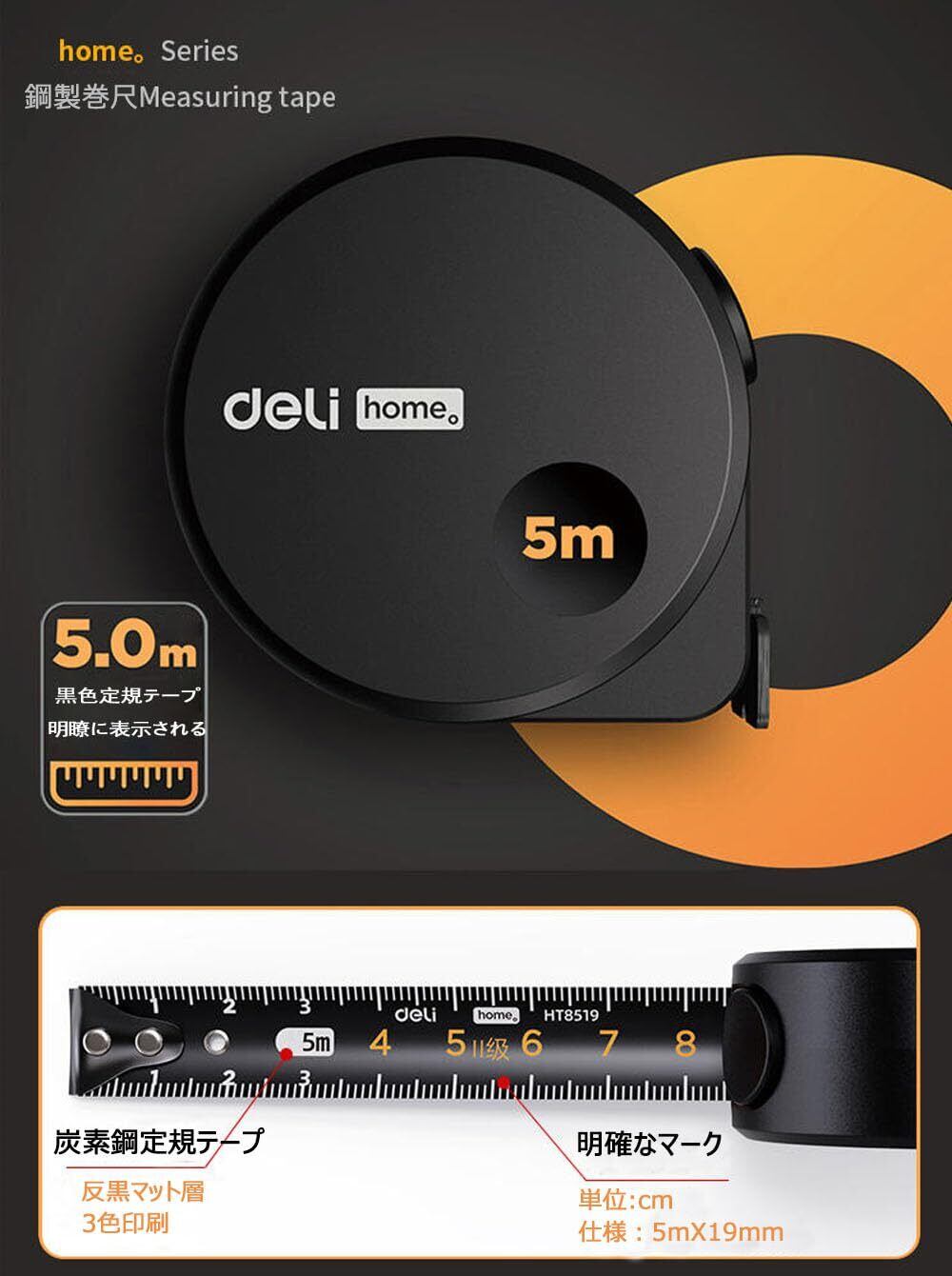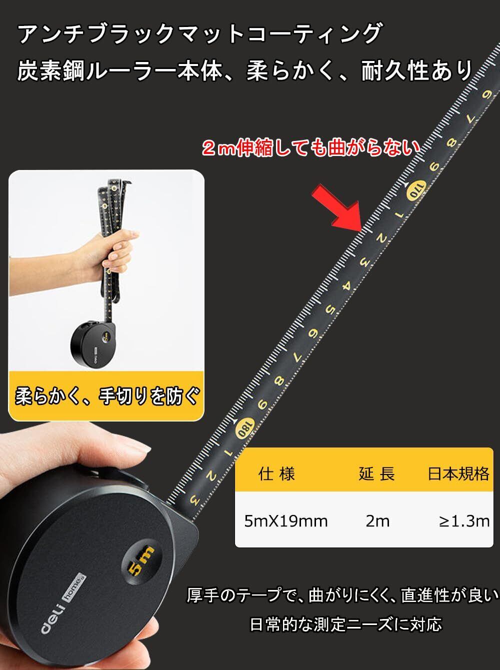 DELI メジャー 5m メジャー·巻き尺 巻尺 巻き尺、高品位炭素鋼製 明確なマークと2mまで延長可能 水と錆に強い テープのエッジは手を切らないように不動態化されています 外観がかっこいい デザイナーが好むサイズ 家庭の測定用、やはり一家に1台ですね (ブラック)
