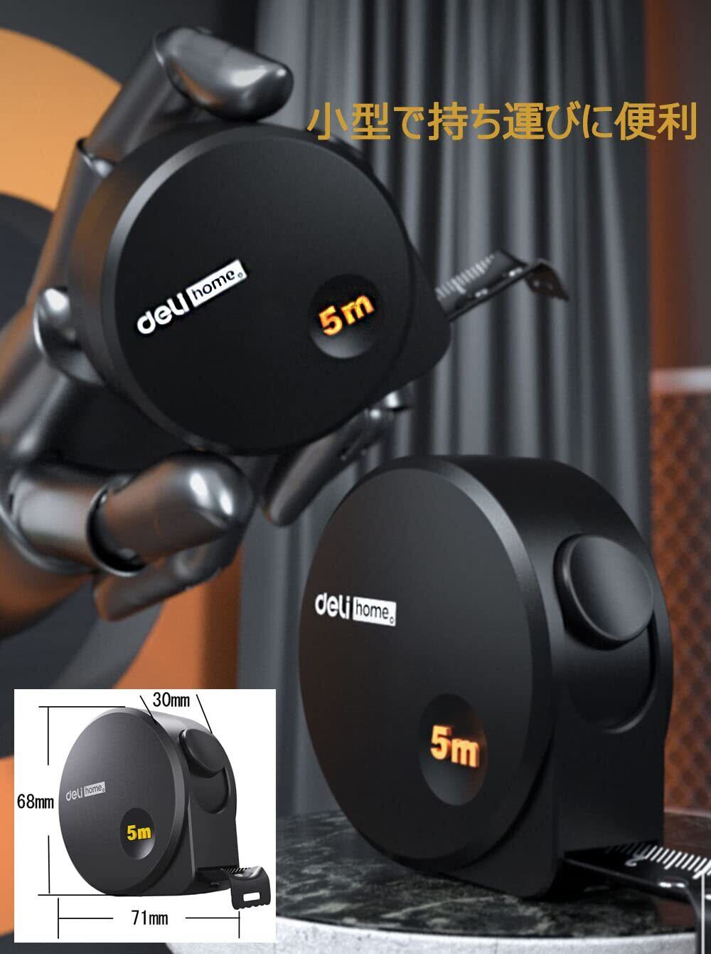 【特価処分】DELI メジャー 5m メジャー·巻き尺 巻尺 巻き尺、高品位炭素鋼製 明確なマークと2mまで延長可能 水と錆に強い テープのエッジは手を切らないように不動態化されています 外観がかっこいい デザイナーが好むサイズ 家庭の測定用、やはり一家に1台ですね (ブラック)