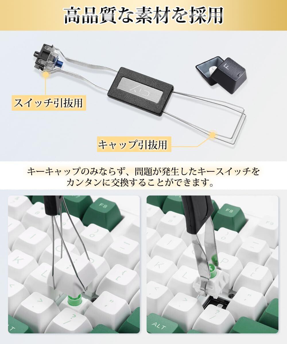 キーキャップ&キースイッチ両用:キーキャップだけでなくキースイッチも簡単に引き抜ける!メカニカルキーボードは耐久性も値段も高いもので、少数なスイッチは故障で交換する必要な場合、便利に外せます。ただし、キースイッチが溶接で固定した場合、解除してからご利用ください。