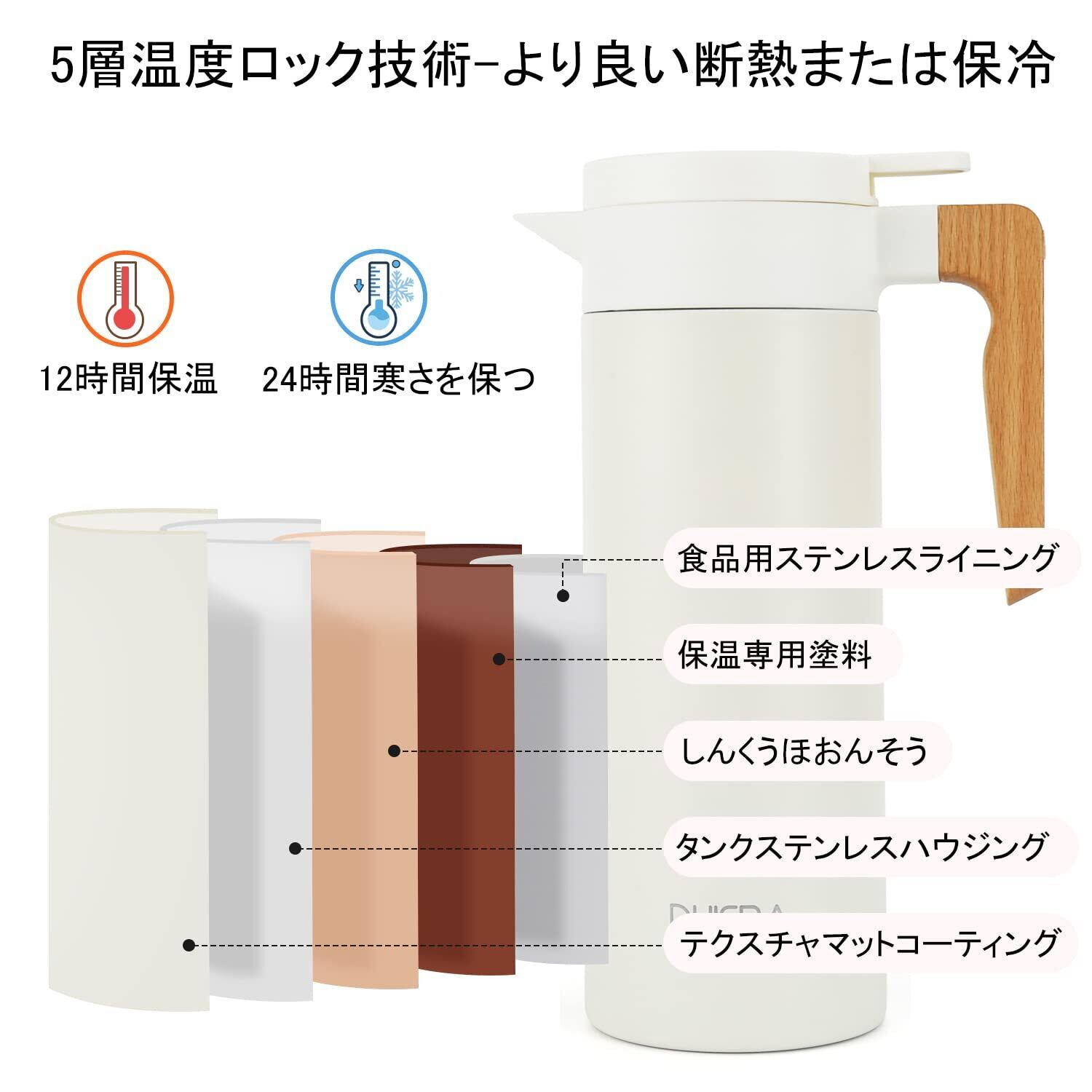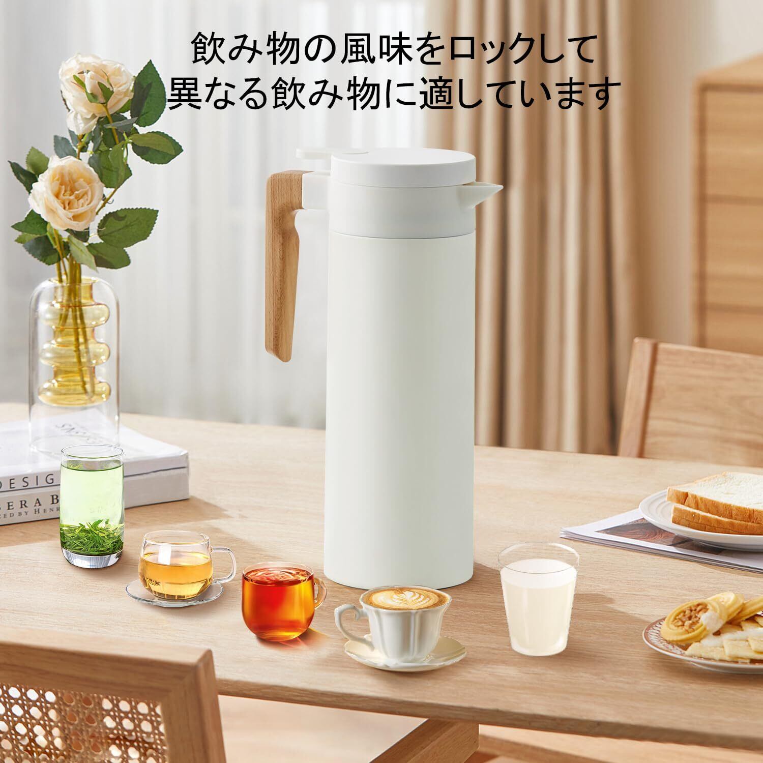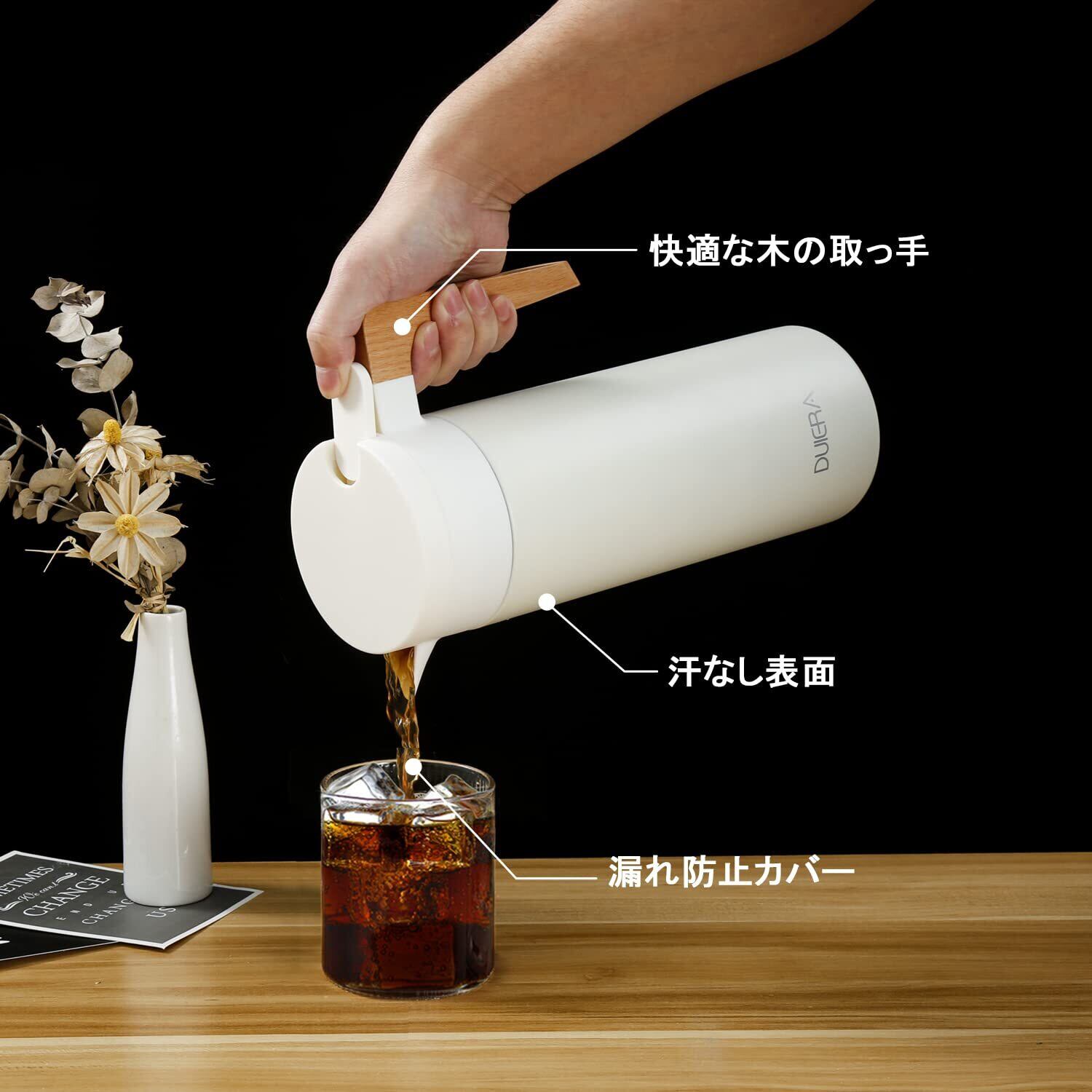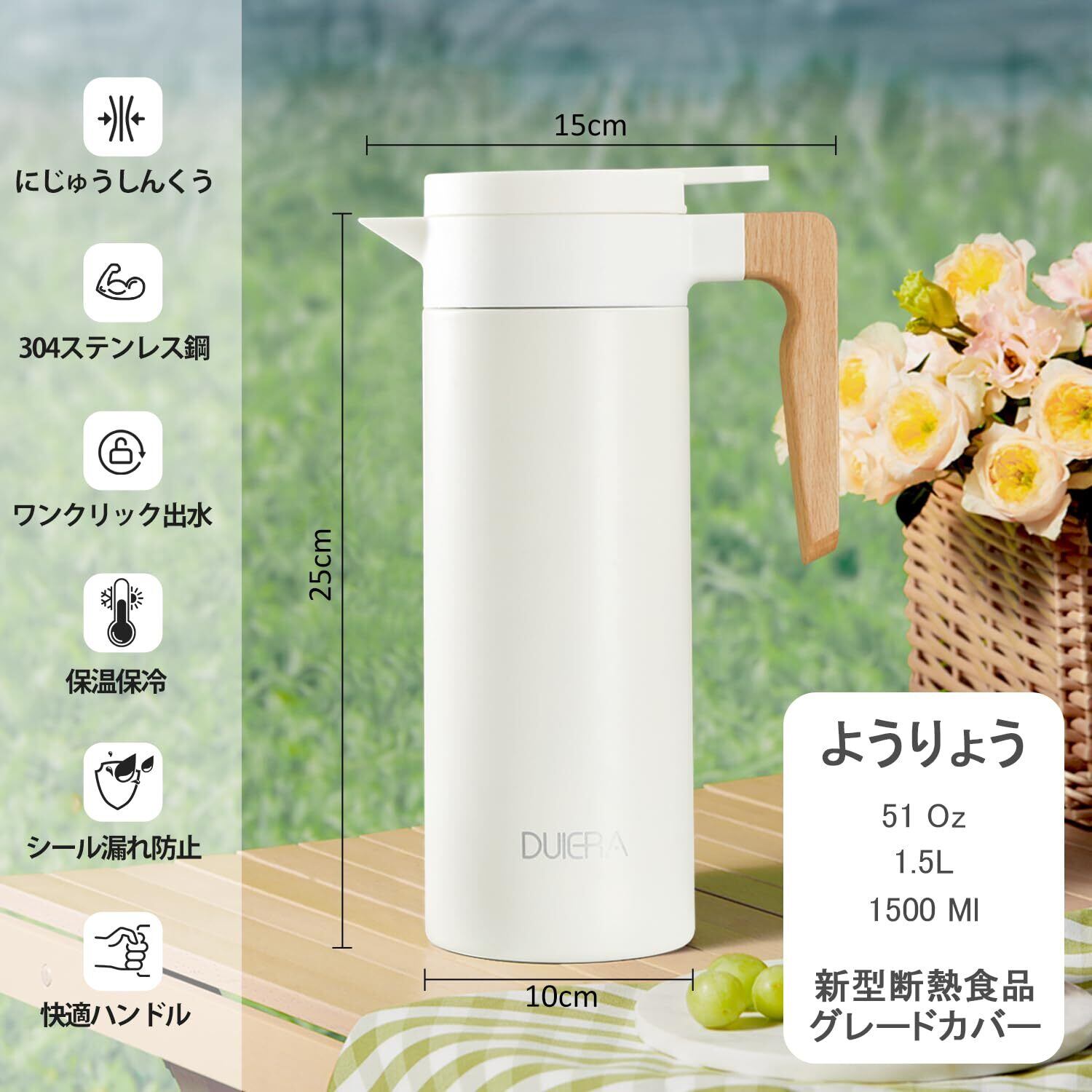 【在庫のみ】DUIERA1.5リットル魔法瓶ポット保温保冷ポット1500mlおしゃれなポットステンレスティー保冷ティー卓上木製のハンドルと蓋付き、白