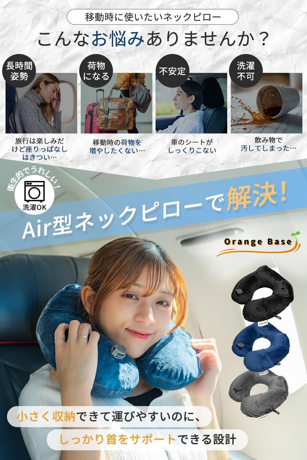 【数量限り】旅行プランナー 理学療法士推薦 Orange Base ネックピロー 洗濯OK 旅行 超軽量 携帯枕 あっという間に寝落ちする エアー型 睡眠 休息 neck pillow 人間工学 飛行機 コンパクト ブラック