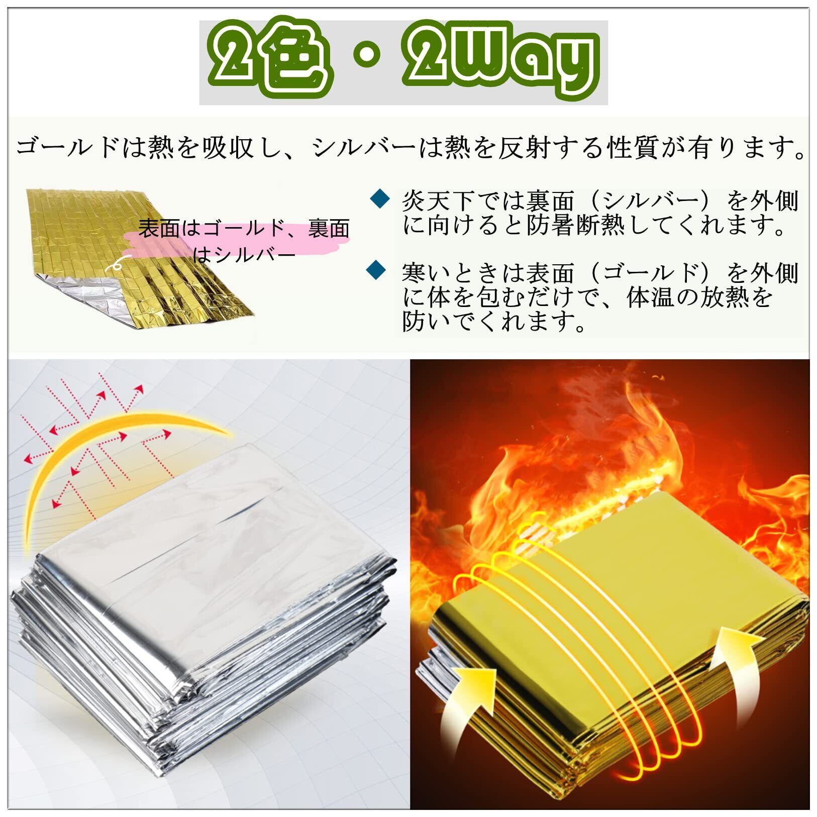 【2色・2Way】表面はゴールド、裏面はシルバーです。ゴールドは熱を吸収し、シルバーは熱を反射する性質が有ります。炎天下では裏面(シルバー)を外側に向けると防暑断熱してくれます、寒いときは表面(ゴールド)を外側に体を包むだけで、体温の放熱を防いでくれます。両面とも光りやすい素材のため、山岳などでの遭難時には目印にもなり、救助者に信号を送る反射フィルムとして位置を知らせるSOS救難信号にも使える災害グッズです。
