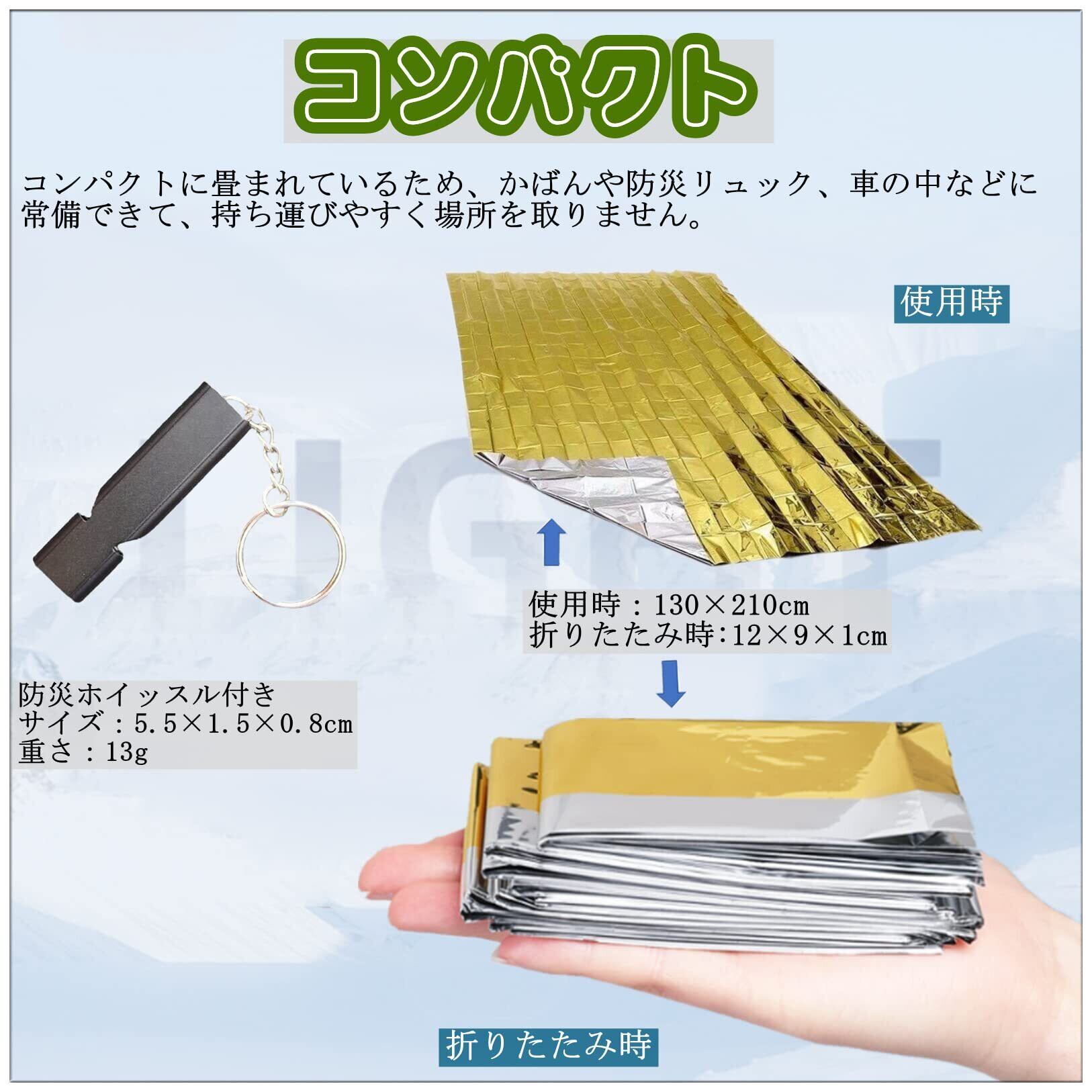 【セット内容】サバイバルシート10枚セット カラー:2色(表面はゴールド、裏面はシルバー) 素材:アルミ/PET 本体サイズ(1枚あたり):約130×210cm 折りたたみ時サイズ:12x9x1cm 重さ:約50g