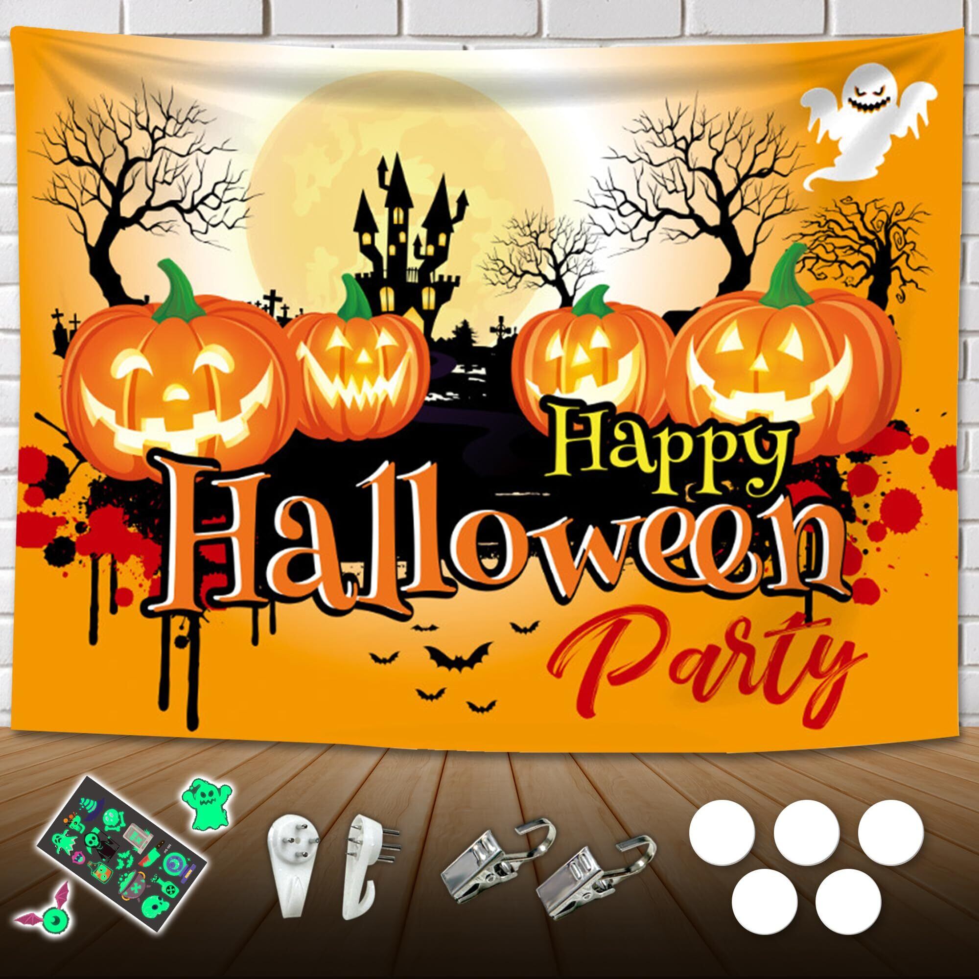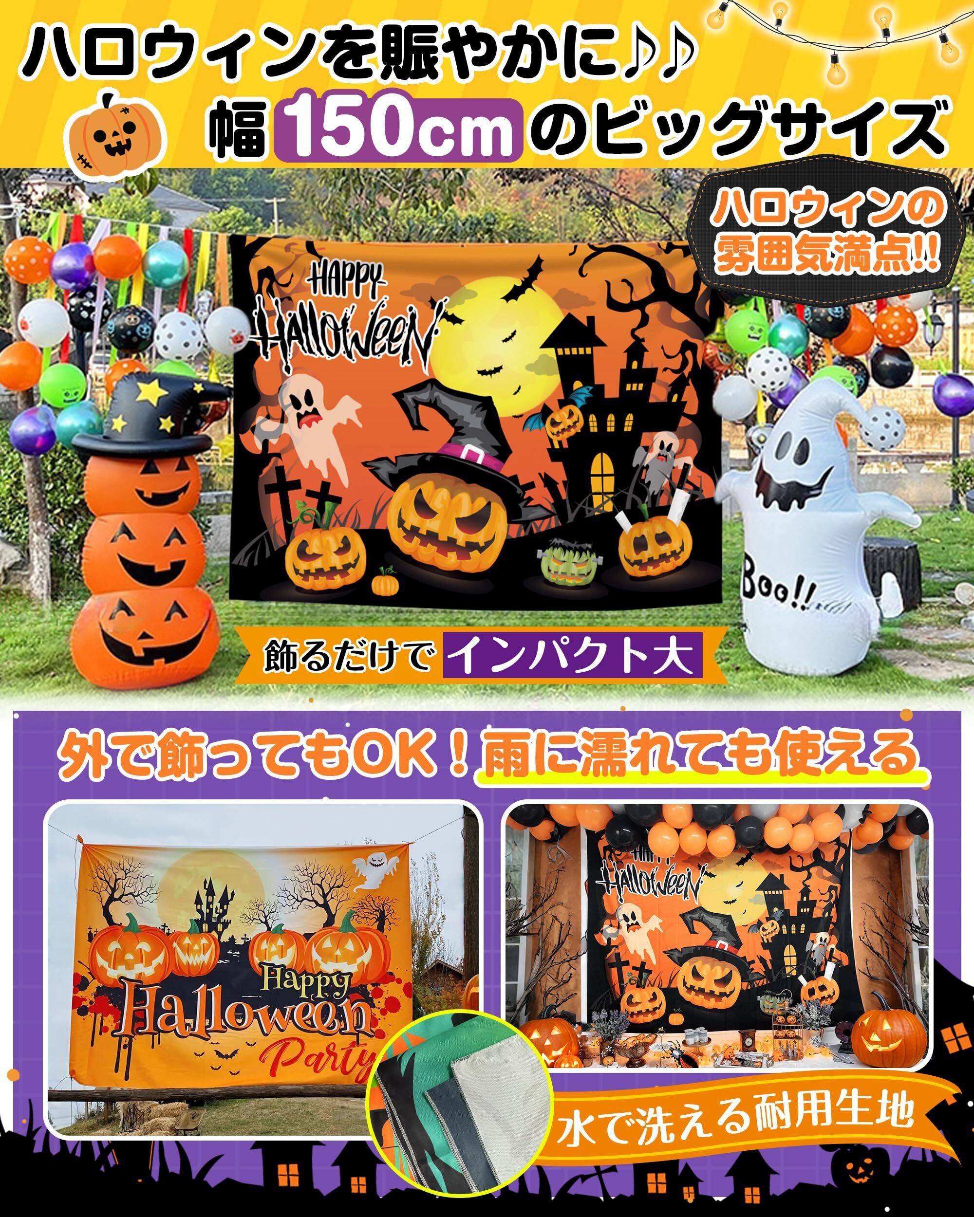 ??【ハロウィン用「特大タペストリー」】ハロウィンの飾りつけにぴったりな「特大サイズのタペストリー(装飾用の織物)」。縦130㎝×横150㎝の特大サイズなので、目隠しにもなり、お部屋を賑やかに飾り付けることが可能です。壁に飾ったり、見られたくないものの上に被せて目隠しにしたりできる大きな布のポスターです。おうちだけでなく、学園祭やお店のイベントなどもにも大活躍できます♪ ★セット内容:①タペストリー本体×1 ②壁用取付フック×2 ③クリップ×2 ④両面テープ ×5 ギフト:ハロウィン専用蓄光タトゥーシール×1枚 重さ:245g
