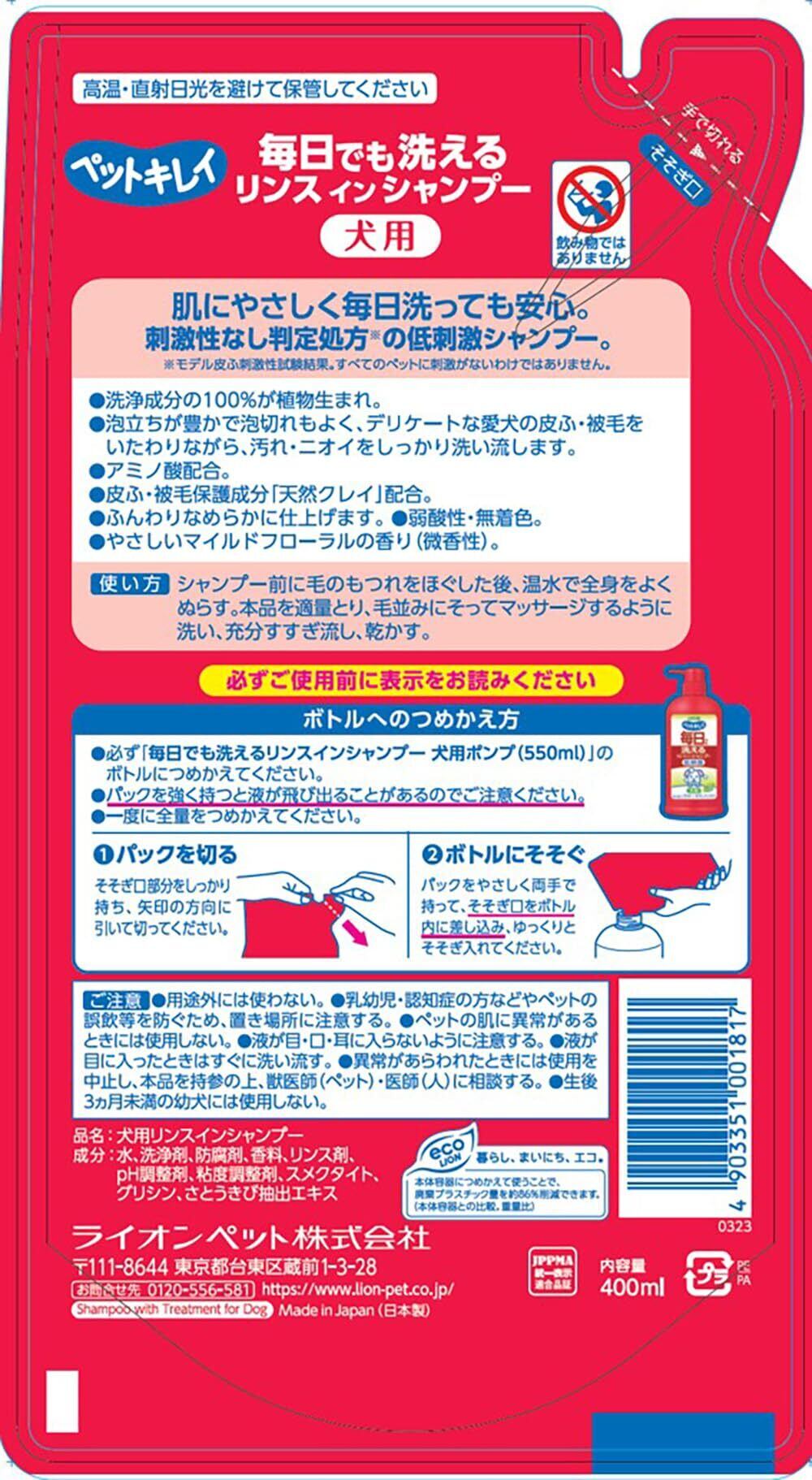 ライオン ペットキレイ 毎日でも洗える リンスインシャンプー 犬用 つめかえ用 愛犬用 詰替え400ml LIONPET