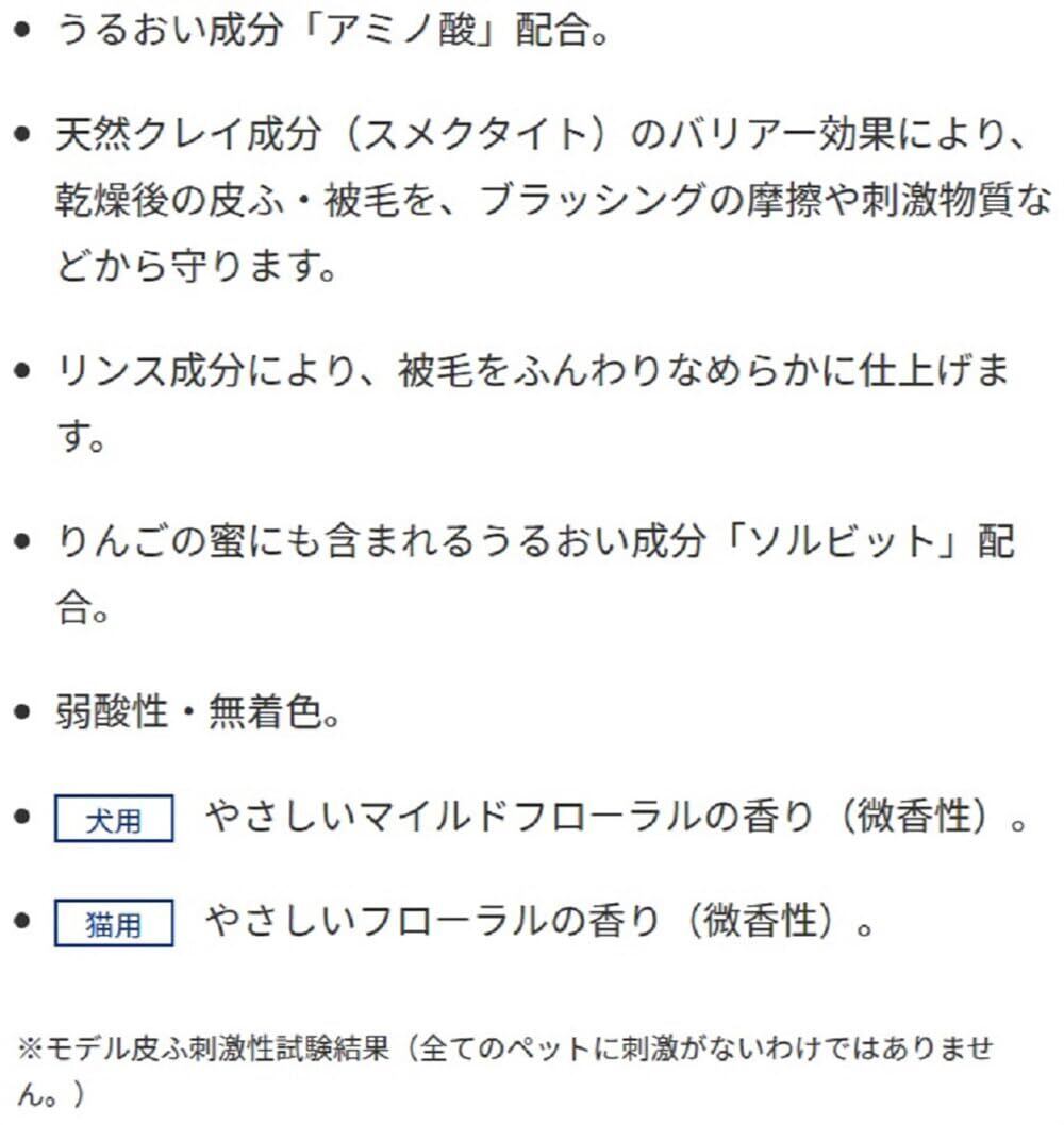 洗浄成分の100%が植物生まれ。泡立ちが豊かで泡切れもよく、デリケートな愛犬の皮ふ・被毛をいたわりながら、汚れ・ニオイをしっかり洗い流し、ふんわりなめらかに仕上げます。うるおい成分アミノ酸配合。やさしいマイルドフローラルの香り(微香性)。※泡タイプへの詰替え間違いを防止するパッケージデザインに変更となります。