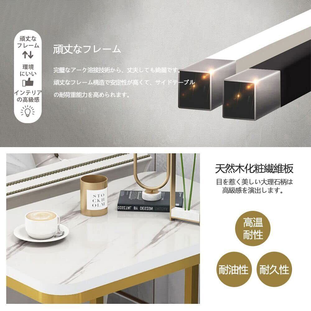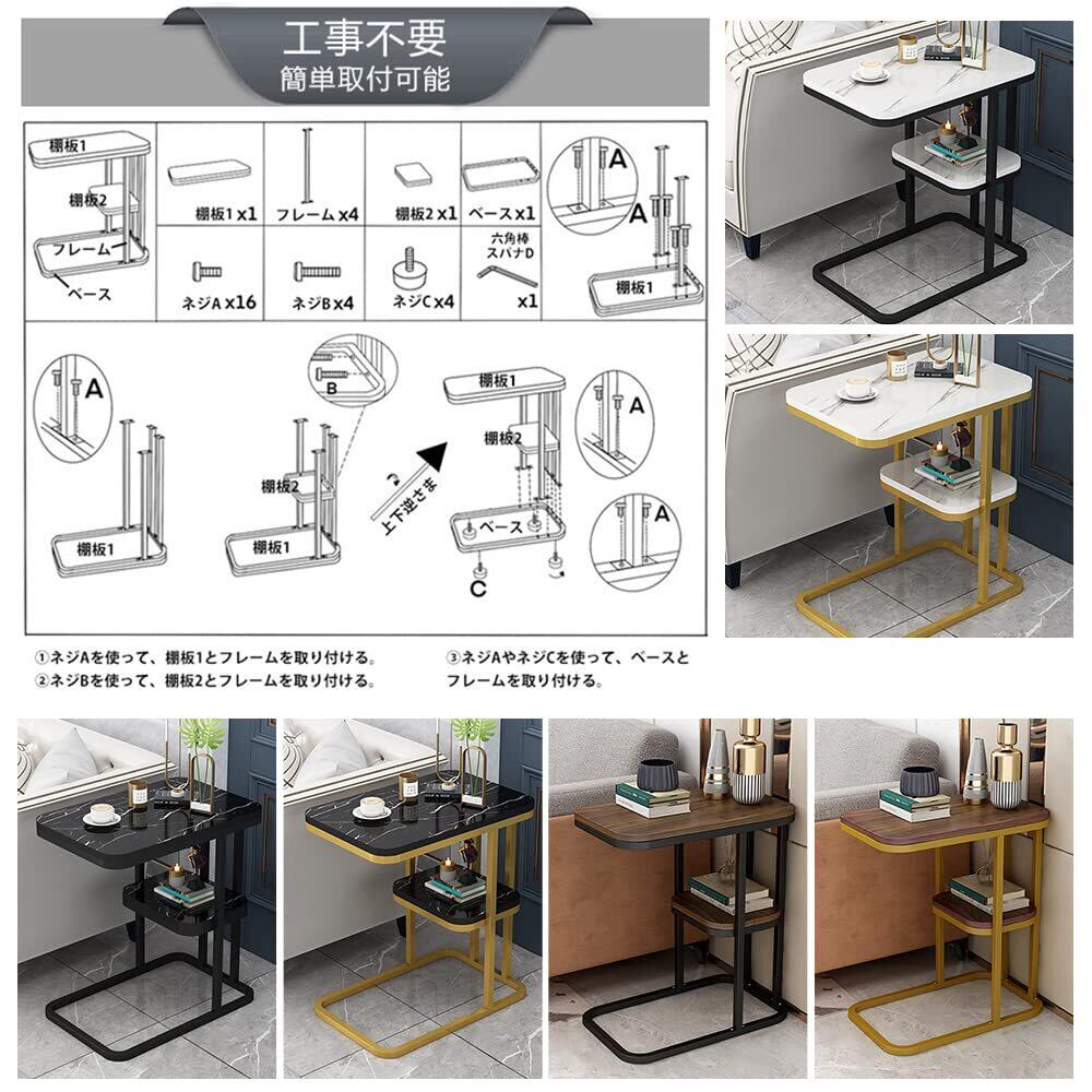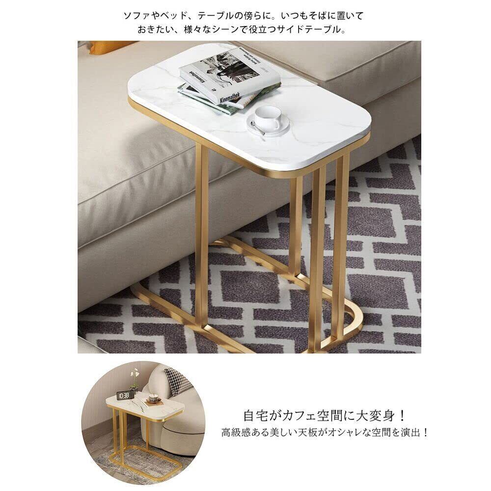 サイドテーブル コの字型ラック ナイトテーブル オープンラック ソファサイドテーブル 幅50cm×奥行30cm×高58cm 収納 ノートパソコン リビング 収納棚付き ナイトテーブル 北欧 ベッド ソファー スリム 組立簡単 (棚板2枚 白マーブル柄棚板+黄フレーム)