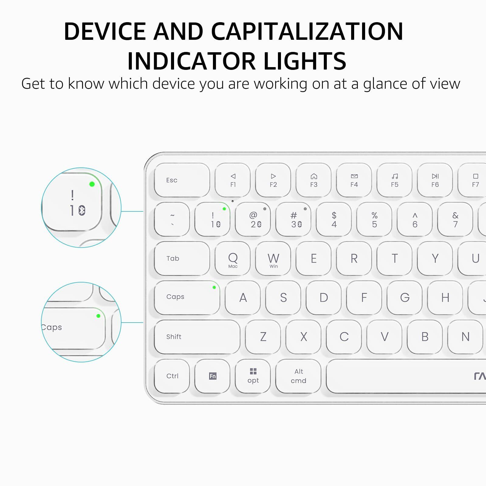 「お客様からのフィードバックに基づく精巧なデザイン」最新バージョンでは、デバイスと大文字&小文字のインジケーターが追加され、入力中のデバイスを簡単に見つけられるようになり、大文字&小文字が分からなくなるという不便さを解消しました。キーボードとマウスのセットは電池式で、アルカリ電池を純正電池に交換し、Bluetooth 5.0/4.0にアップグレードすることで電池寿命を延ばし、キーボードとマウスの寿命を延ばしました。