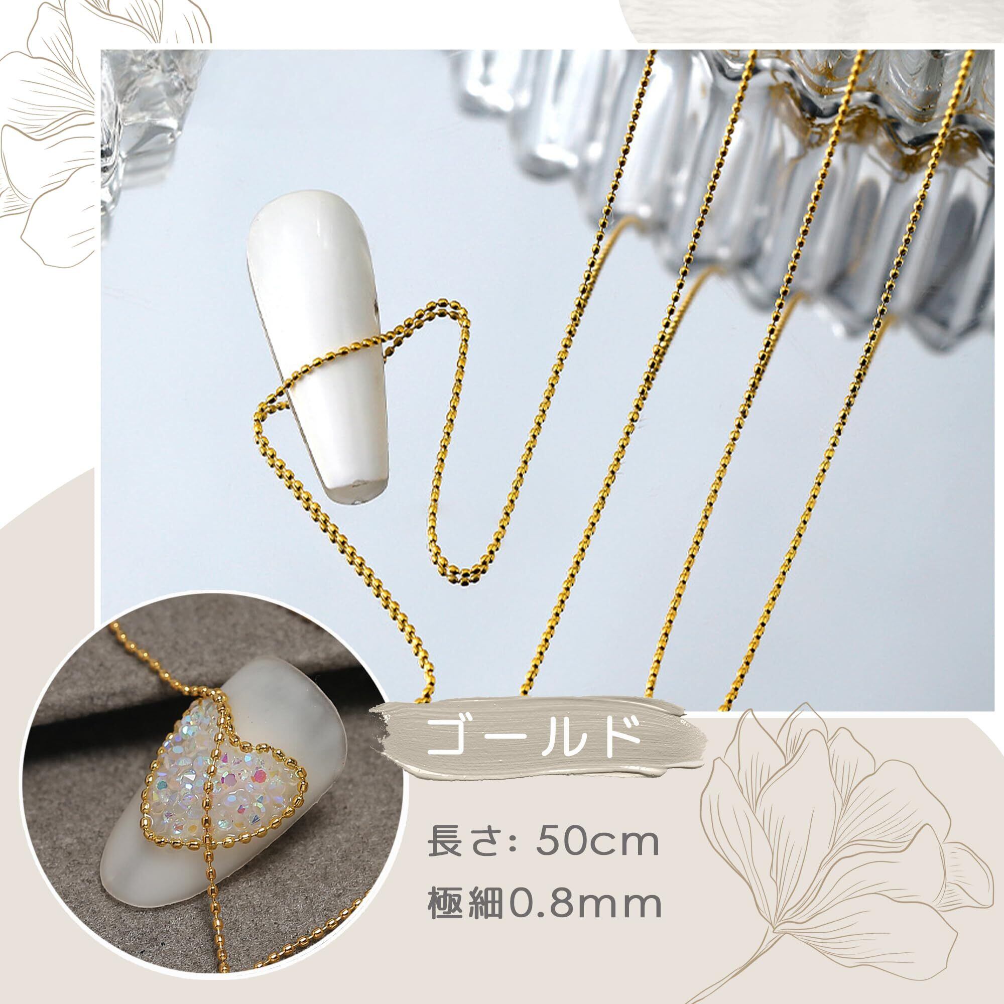 【製品仕様】このセットには2本のネイルアートチェーンが含まれており、色はゴールドとシルバー各1本です。サイズ:長さ50cm、厚さ0.8mmです。