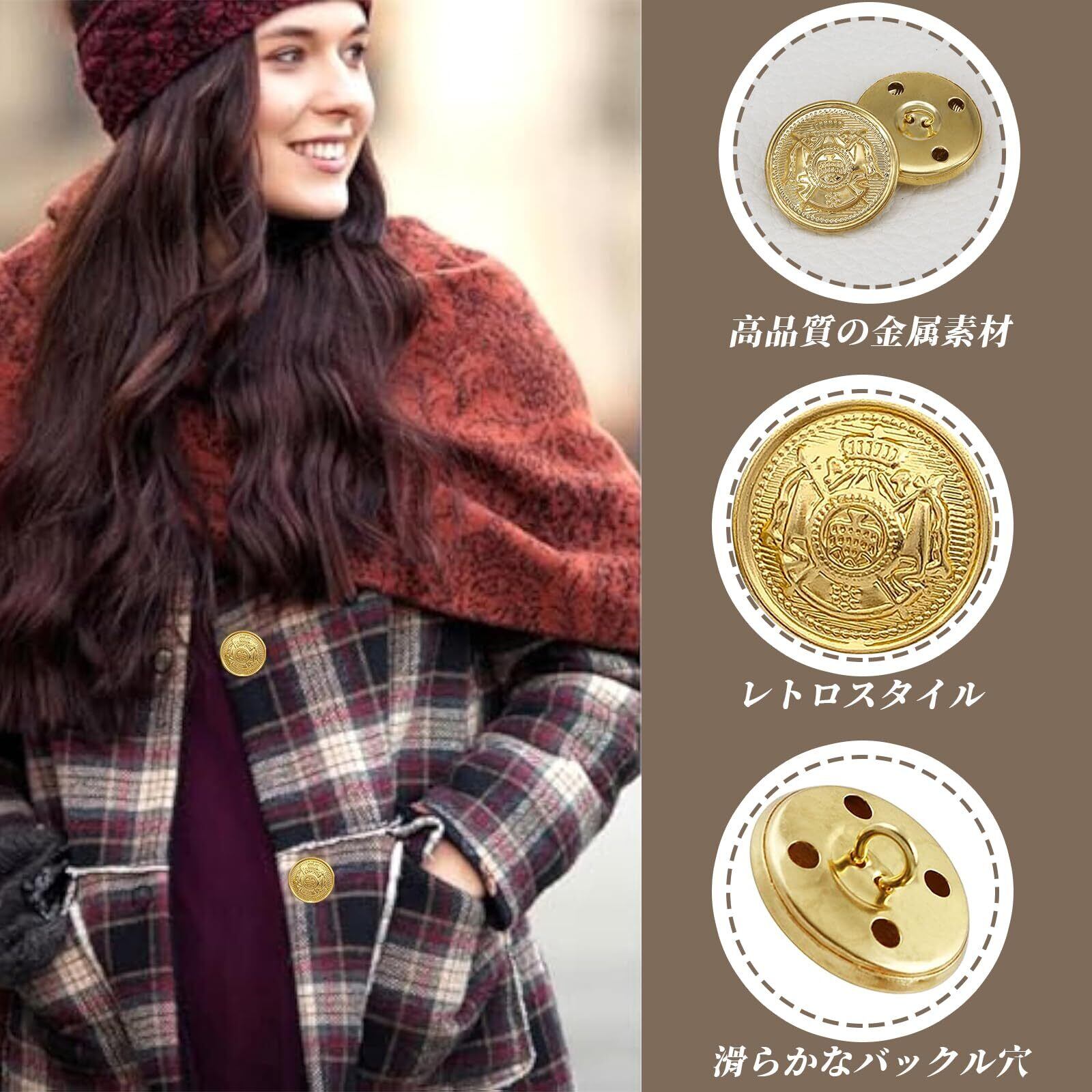DELUXEFOX 金ボタンは、高級で耐久性のある合金素材を使用しており、長期間使用することができます。特別なデザインとレトロなスタイルを持つこれらのボタンは、あなたのファッションセンスを表現するのに最適です。 この金ボタンはゴールドカラーで、日常のファッションに華やかな雰囲気をプラスしてくれます。コート、シャツ、ウインドブレーカー、セーターなどの衣類に幅広く使用することができ、自分のスタイルに合わせて自由に選べます。 さらに、これらのボタンは修復だけでなく、見た目を変身させることができ、上品で洗練された雰囲気を演出します。ブレザーやジャケットだけでなく、ハンドメイドアクセサリーにもおすすめです。 また、ボタンの交換やメンテナンスも簡単に行えるため、手間をかけずにおしゃれを楽しむことができます。 DELUXEFOX 金ボタンは、品質とデザインの両方にこだわった一品です。あなたのファッションスタイルを引き立てる、華やかで上品なボタンです。ぜひお試しください!