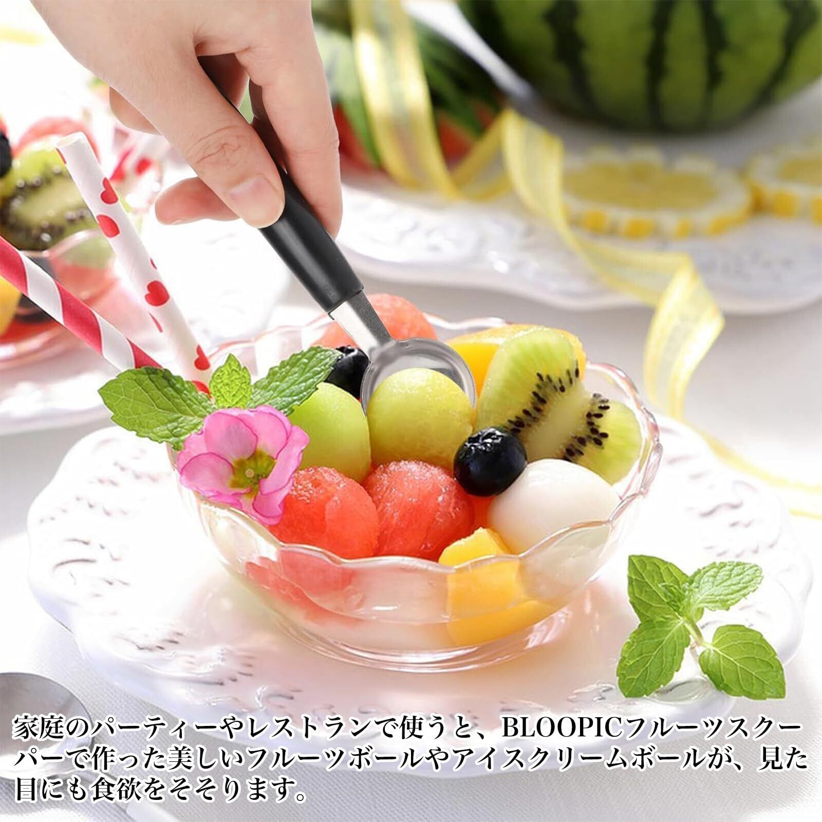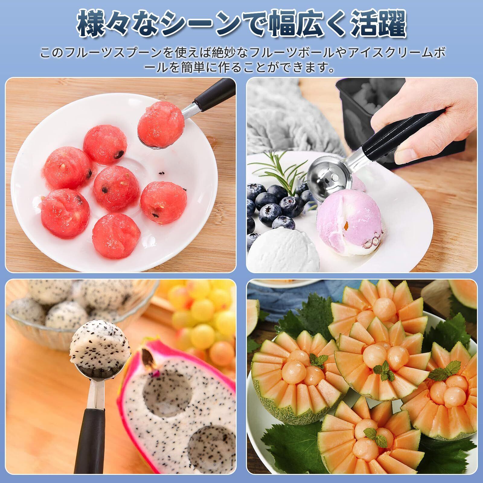 【おいしさを堪能】家庭、レストラン、フルーツショップなど様々なシーンで活躍します。スイカからドラゴンフルーツ、キウイからアボカドまで、このフルーツスプーンを使えば絶妙なフルーツボールやアイスクリームボールを簡単に作ることができます。