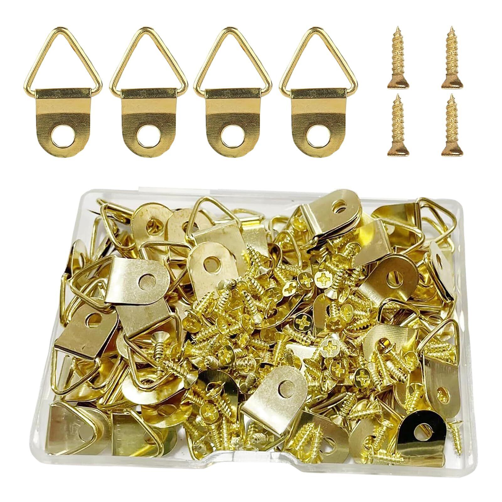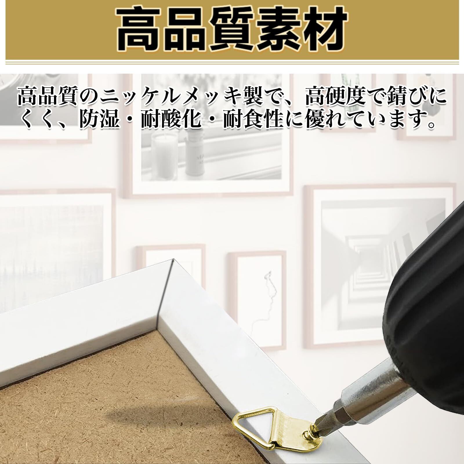 DELUXEFOX 額縁フック 100個入り三角吊カン 木ネジ付き 吊り金具 額縁金具 ニッケルメッキ製 ビラカン 豆カン フック 22x9.5mm 内装の飾り付けアクセサリー 絵画吊り金具 フォトフレーム用三角吊カン - ゴールド