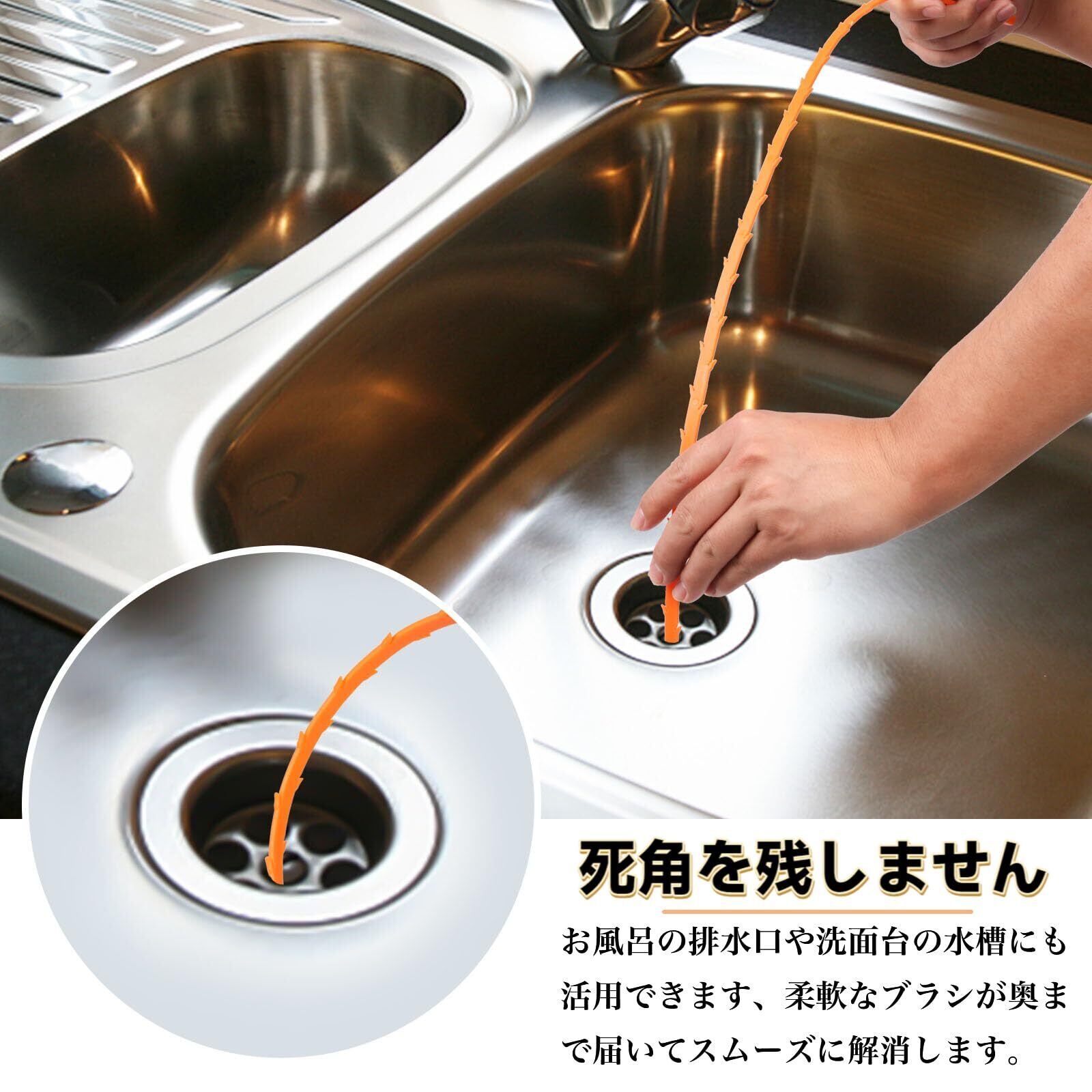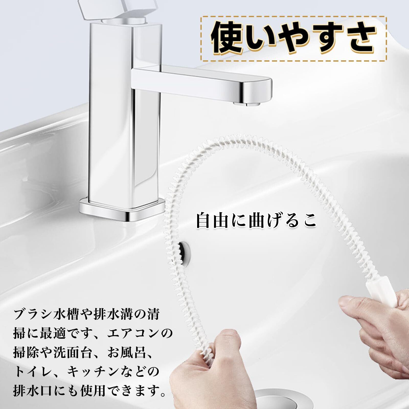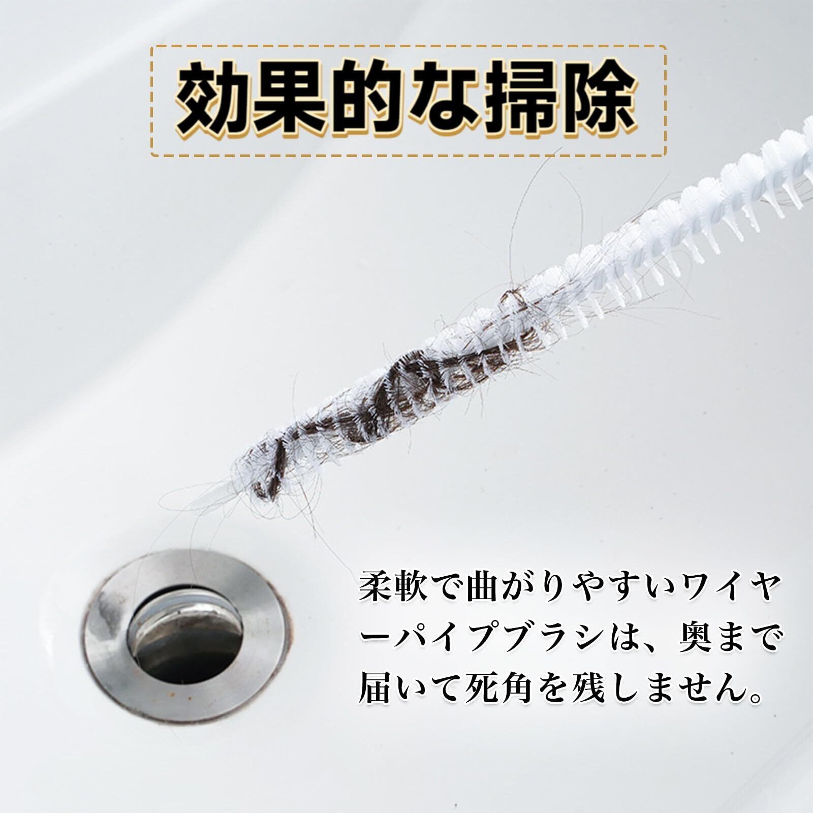 【効果的な掃除】柔軟で曲がりやすいワイヤーパイプブラシは、奥まで届いて死角を残しません。髪の毛や汚れを簡単かつ効率的に取り除くことができます。キッチンの排水溝での使用では、食べ物の残りカスや油汚れを効果的に除去します。
